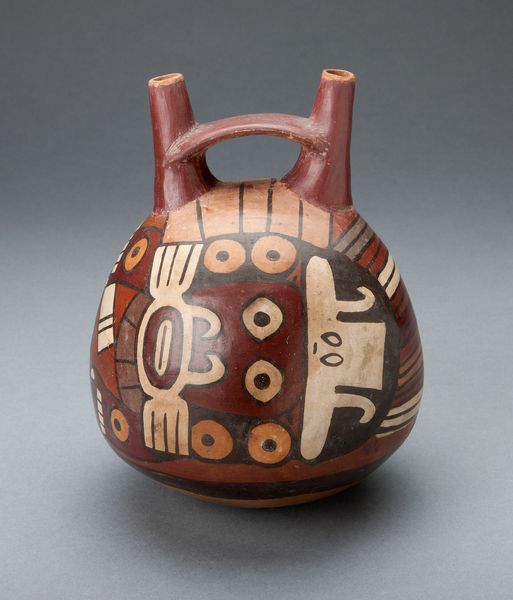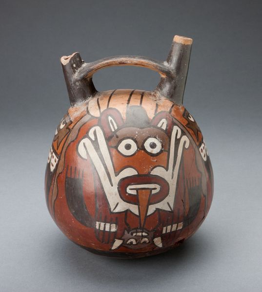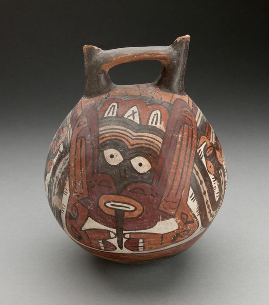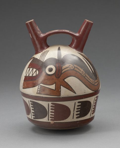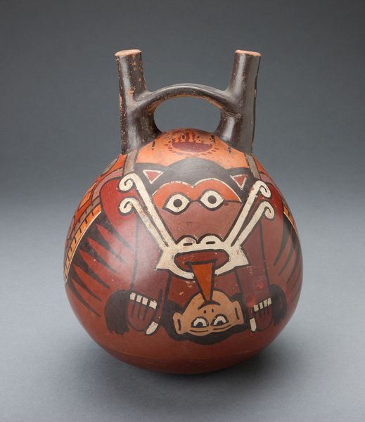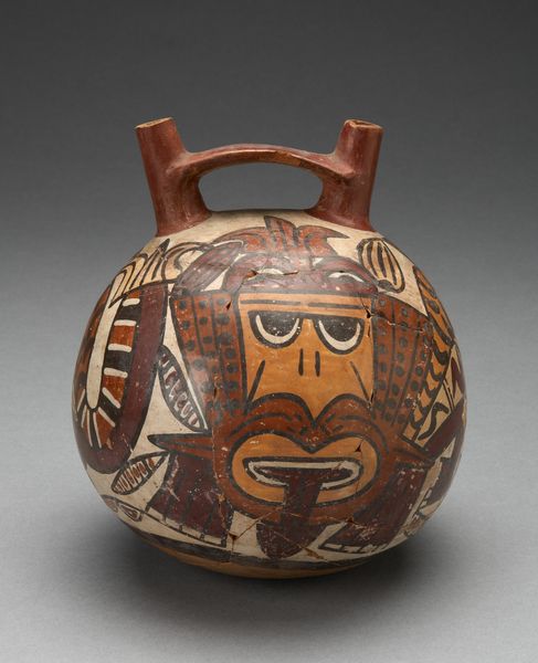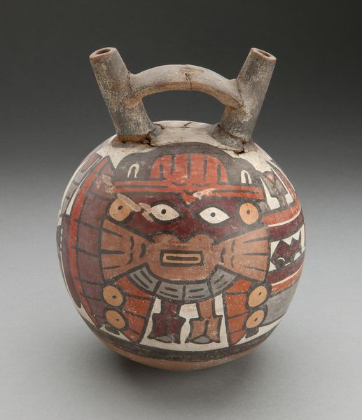Editor: This is a ceramic "Double Spout Vessel Depicting Masked Figure with Serpent Attributes" created by the Nazca people around 180 to 500. It has a whimsical appearance that feels deceptively simple. How do you interpret this piece based on its composition? Curator: Initially, I'm drawn to the formal properties, primarily its structure. The spherical volume is crowned by the functional double spouts, bridged by a strap handle. What strikes you about the application of color and line in defining the depicted figure? Editor: The use of color seems intentional in emphasizing certain shapes. The bold outlines make the serpent and mask designs jump out, like stylized symbolism on the pottery surface. How significant are these colors and graphic elements to understanding the Nazca culture? Curator: Colors, line, and form were essential for communicating meaning. Consider the formal relationships between the positive and negative spaces, the interplay of curvilinear and rectilinear shapes. Ask yourself, does the design embody symmetry, asymmetry, repetition, or perhaps, an evolution of form? Editor: I never considered it that way before. Now it seems more abstract and deliberate. Are the abstracted shapes around the central face meant to signify something beyond a visual language? Curator: Potentially. These choices, these formal articulations are windows into understanding the artists’ cognitive processes. By exploring the relationships between the art elements, we appreciate not only their craftsmanship but also their communication strategies and inherent sophistication. Editor: I can see now the power of this object through your lens; analyzing how shape and form impact and construct the message is insightful. Thanks for pointing me to that direction! Curator: And you have provided the lens of inquiry to decode the artistry in this fascinating indigenous craft.