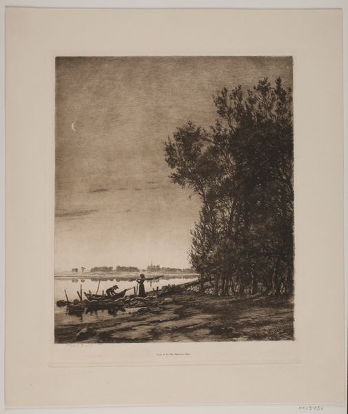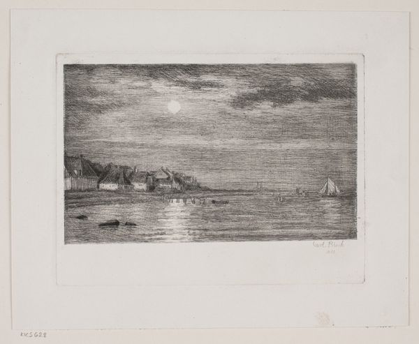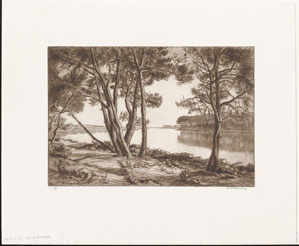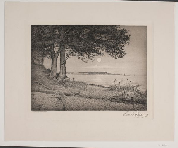 Editor: So, this etching, "Aften ved Strandmøllebugten," or "Evening at Strandmølle Bay," created in 1914 by John Lübertschitz, it's very tranquil. It feels almost… untouched, like a scene from a time capsule. What’s your take on it? Curator: This print offers a fascinating lens through which to examine the cultural perception of the Danish landscape in the early 20th century. How do you think it speaks to ideas of national identity or belonging during that period, particularly considering the rise of national romanticism in art? Editor: I hadn’t really considered that. Maybe the serene depiction implies a stable, enduring nation, in contrast to the turbulence brewing in Europe at the time? The Impressionistic style definitely romanticizes the natural scenery. Curator: Exactly. Lübertschitz uses a technique emphasizing light and atmosphere. Now, considering the print medium itself – etching – how does its accessibility potentially impact the dissemination and public reception of this idealized landscape imagery? Editor: Because it’s a print, multiple copies can exist, right? That makes it available to a broader audience, potentially reinforcing those nationalistic ideals on a wider scale. Unlike a unique painting only viewed by a privileged few. Curator: Precisely! The power of the reproducible image lies in its democratic potential and the possibilities for shaping collective memory. Were such landscapes intended for purely aesthetic enjoyment or did they play a part in defining Danish identity? Editor: Thinking about it that way really makes me consider the artist's intention and how the social context might influence viewers. Curator: Indeed. The art world constantly adapts to historical factors. What did you find the most interesting part of this? Editor: Considering landscape art as a kind of soft power, or gentle propaganda, it gives me so much more appreciation of its reach and social importance! Curator: That's great to hear. Reflecting on this beautiful work with you really made me think about the powerful interplay of artistic intention, socio-political context, and medium in shaping national identity.