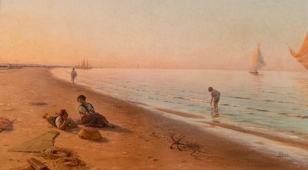 Curator: Here we have Pasquale Celommi's "Partenza Della Lancetta," an oil on canvas painting that really captures a moment in time by the seaside. The genre scenes and landscape details create an absorbing piece for our collection. What’s your first impression? Editor: A muted symphony of nostalgia. A quiet image that hints at bigger things, the ships, perhaps even hinting at a journey or departure. I am immediately drawn in by the figures on the beach; there's an atmosphere of serenity mixed with that human feeling of melancholy, like when the sun sets. Curator: Absolutely. Celommi seems to emphasize a visual bridge between the maritime world and daily life. In iconographic terms, the boat often symbolizes transition, either in life, or perhaps even something deeper, the journey of the soul. The mother and child provide a stark reminder of that duality. Editor: Yes, you can almost taste the salt in the air. The way he uses light, bathing everything in this rosy, dreamlike hue... it reminds me of half-remembered childhood evenings at the beach. A mother and child—such a central, timeless image, holding hands almost like embarking on an uncertain, emotional voyage together. The overall effect transcends simple realism, I think. It pulls at the heartstrings, maybe hinting at broader themes. Curator: I concur entirely. The reflection of the figures in the wet sand draws us deeper into considering symbolic duality: not only of physical presence on the beach and their reflected spiritual image, but also of their relationship. You can see so much, so elegantly placed, just in this seemingly "simple" genre scene. Editor: And it also feels honest, doesn't it? Raw and deeply human, because there's something in the rendering that makes it more about evoking a universal feeling than striving for precise photographic accuracy. That almost painterly haze gives it a touch of soul. Curator: In this, Celommi offers a scene suspended between land and sea. Thank you for your insight; a most inspiring piece! Editor: The pleasure's all mine! It's a great reminder that even the simplest moments can echo with profound stories.