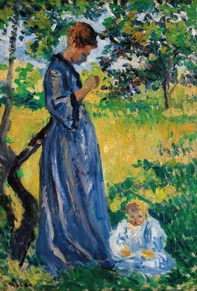 Editor: So, here we have "In The Woods At Giverny- Blanche Hoschedé At Her Easel With Suzanne Hoschedé Reading," attributed to Claude Monet. The soft light and tranquil scene give it such a peaceful, almost dreamlike, quality. What jumps out at you when you look at it? Curator: Well, it immediately speaks to the evolving role of women within the artistic sphere during that era. Notice how the painting portrays not one, but two women actively engaged in intellectual and creative pursuits. Consider this in relation to the broader societal context; these depictions challenge traditional gender roles of the time. Editor: That's fascinating. So, you're saying it's more than just a pretty picture of a summer's day? Curator: Exactly. The scene at Giverny captures a moment when artistic expression was increasingly accessible to women, at least within certain social circles. Look at how the positioning of Blanche, front and center at the easel, visually asserts her role as an active creator. The choice to depict Suzanne engrossed in reading also subtly advocates female intellectualism. Do you think that Monet’s status at that time would influence how these portrayals were perceived? Editor: Definitely! Monet was a major figure by this point. Depicting women in these roles, by such a well-known artist, would have helped normalize these images within the broader culture. I hadn't considered how directly this links to social changes! Curator: It reveals how art and social evolution intertwine, influencing, and reflecting upon one another. Think about who got to be *in* the frame, and who got to be *behind* it. It is really the socio-political landscape we see reflected here in impressionistic light. Editor: This really gives me a new perspective, beyond just brushstrokes and light! I’ll definitely look at impressionist works with more attention to the social dynamics represented. Curator: And remember that these portrayals were selective. Not all women enjoyed these freedoms, and that tension, too, shaped art of the time.