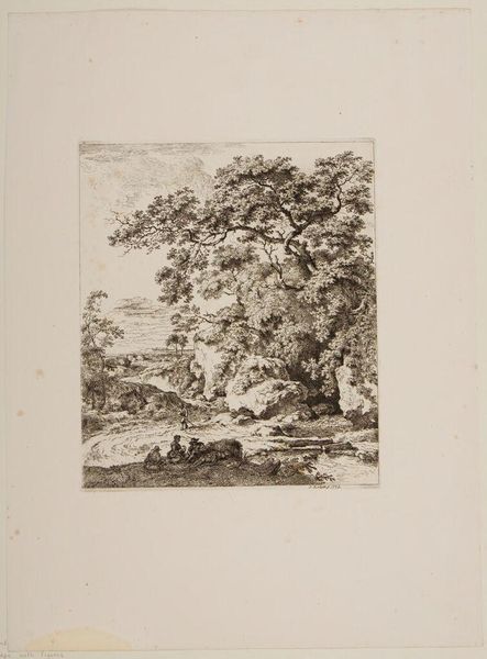 Curator: This is Alexandre Calame's "A Couple by a Stand of Trees." Editor: The etching feels quite somber, almost brooding, despite the seemingly pastoral scene. The trees are so densely packed. Curator: Indeed. Observe how Calame uses the etched lines to create a textured surface, almost a fabric of marks. The light seems to struggle to penetrate the tree canopy. Editor: Trees, of course, have always symbolized life, growth, and connection to the earth. Perhaps the couple seeks refuge, or maybe they're lost within a deeper psychological landscape. Curator: Perhaps. But consider, too, the formal tensions: the contrast between the dense foreground and the hazy, indefinite background. The eye is never allowed to fully rest. Editor: It's a reminder that even in nature, symbolism and technique blend to create a powerful emotional resonance. Curator: Yes, and hopefully a deeper appreciation of Calame's vision.