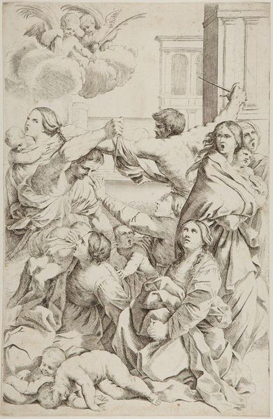 Editor: Carlo Sacchi's "Adoration of the Shepherds" captures a humble scene. It feels very human, with the everyday details of the stable. What can you tell me about its cultural context? Curator: This print reflects the Counter-Reformation's emphasis on relatable religious imagery. The humble setting and focus on ordinary people aimed to make faith accessible, countering Protestant critiques of the Church's opulence. How do you think this shift in artistic focus impacted public perception of religious figures? Editor: That’s interesting. It seems like it would have made religion much more personal. Thanks, I learned a lot. Curator: Likewise, it’s crucial to analyze how artists like Sacchi played a role in shaping religious narratives through accessible imagery.