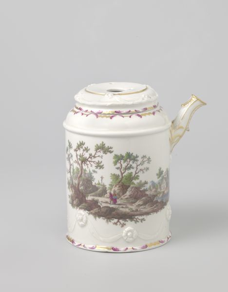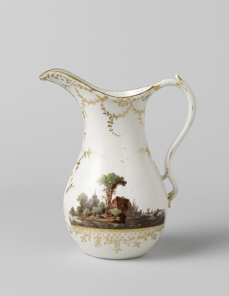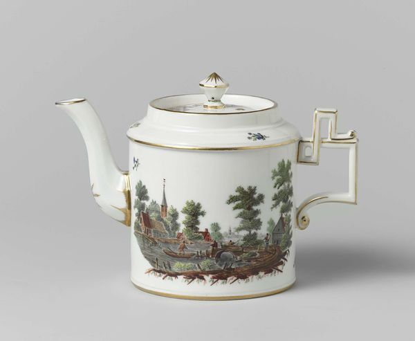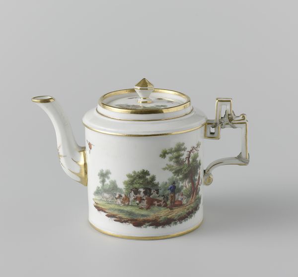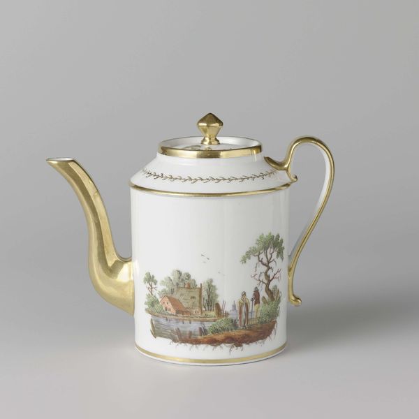 Editor: Here we have a "Teapot and milk jug" from around 1800-1805, made by Koninklijke Porseleinfabriek Dommer & Co. in porcelain. It is beautiful! It makes me think of stories and fairytales. How do you interpret this work and the imagery chosen to decorate such a common object? Curator: What strikes me immediately is the pastoral scene rendered on such a refined object. A humble, everyday landscape finding its place upon something used in the rituals of the upper classes. Consider the landscape itself – it’s a carefully constructed image of leisure. What kind of world do you imagine the owner inhabits, based solely on this decoration? Editor: It is idealized! A relaxed and pleasant world... Perhaps that domestic image signals social aspirations for the person who used it, connecting them to nature, perhaps? Curator: Precisely! Images like these speak to cultural memory. A specific notion of countryside life gets fixed to porcelain and passes to us. See how the colours – the greens and browns of the landscape, combined with the gilt trim – add an element of restrained luxury? Porcelain itself became a symbol, remember: the secret of making it guarded jealously in Europe. This is not mere decoration. The act of drinking tea, using porcelain ware became enmeshed with social meaning, rituals and political ideas. What feelings does this kind of idealized scenery evoke in you? Editor: A bit of longing, perhaps? It presents an attractive fantasy. I think I now better grasp how imagery influences how we remember a certain place, and how the decoration becomes so important in reading the history of objects like this one. Curator: Indeed, the convergence of material, imagery and function is powerful. It demonstrates how deeply intertwined art, everyday life and historical perception are.