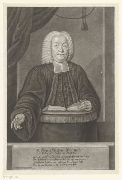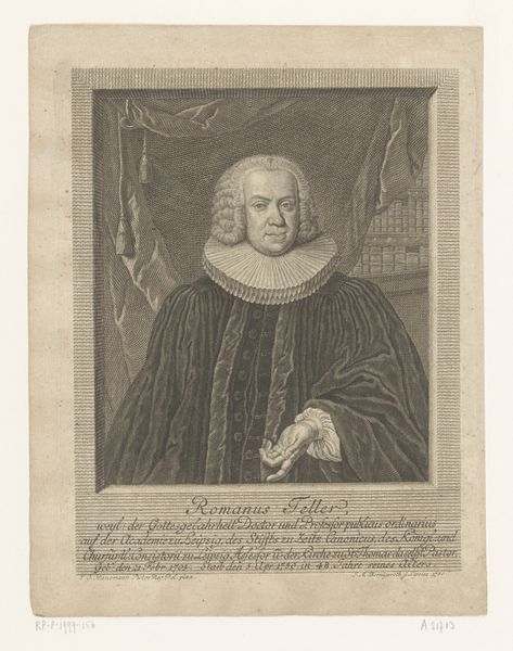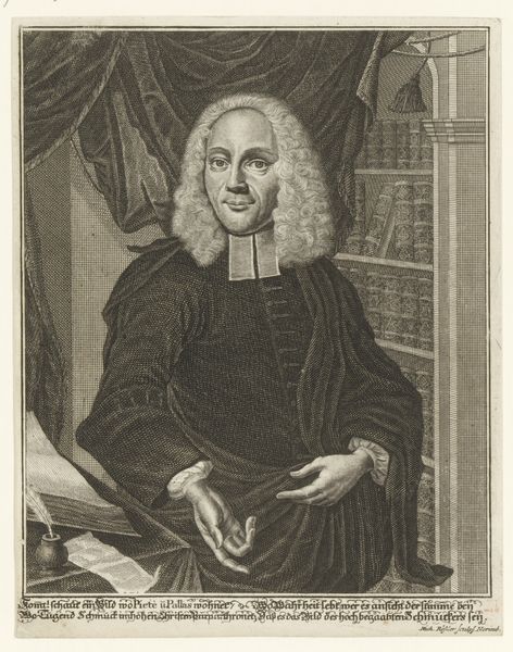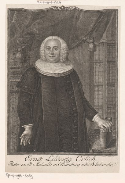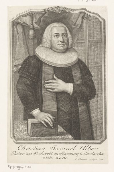 Curator: Let's consider this detailed engraving from 1750: a portrayal of Samuel Seelandt rendered by Christian Fritzsch, currently held in the Rijksmuseum collection. It gives us much to unpack about class, religious role and position. Editor: It strikes me first as rather somber. All that grey! But his gaze is surprisingly direct, as if he's daring me to judge his rather enormous ruff. Almost humorous. Curator: The ruff is key, I think. Consider the function of these objects in signaling not just wealth, but social status and even, potentially, adherence to certain moral codes or intellectual frameworks. The inscription denotes that Seelandt was Deacon at St. Nikolai in Hamburg which contextualizes the piece beyond just visual representation, providing a distinct anchor within a network of societal expectations. Editor: It also, oddly, reminds me of a giant Elizabethan lampshade. Sorry! But visually, the texture is superb. You can almost feel the crispness of the starched linen. Do you think he picked it out himself? Maybe it's the height of fashion amongst Hamburg Deacons? Curator: One wonders about the power dynamics embedded in representation itself, particularly when considering an individual like Seelandt situated within the religious and social hierarchies of 18th-century Hamburg. Fritzsch, as the artist, inevitably interprets as much as depicts. What is the effect, therefore, of his composition on Seelandt’s perceived authority? Editor: Right. He's got that hand strategically placed on a book – subtle nod to knowledge and piety? He’s saying, “I'm important, serious, read things..." Perhaps. Curator: Exactly! And by engaging intersectionally—probing considerations around profession, the religious patriarchy of the period, as well as gendered codes woven into such a display— we can move toward unveiling richer sociohistorical perspectives via art historical discourse. Editor: All that in one portrait? Well, it definitely gets you thinking, beyond just wondering how long it took him to get dressed. The engraving captures a certain human presence, despite the rigid formality. You sense a person there, slightly world-weary, perhaps. Curator: Yes, reflecting further expands and enriches this piece. Thank you. Editor: Likewise, I have appreciated our perspective sharing, expanding beyond that gigantic ruff.