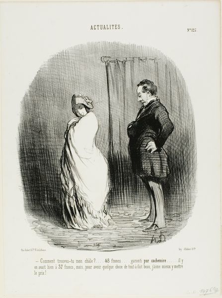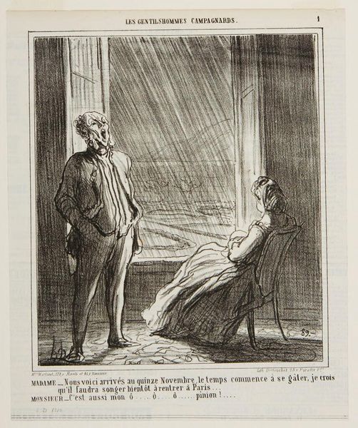 Curator: Looking at Honoré Daumier's lithograph, "Madame...Nous voici...au quinze Novembre," dating to the 19th century, I am immediately struck by the artist’s sharp commentary on bourgeois life. What are your initial impressions? Editor: My first thought goes to the downpour outside the window—it overwhelms everything. I sense claustrophobia and an underlying tension within the domestic space. The graphic quality of the rain almost feels like imprisonment. Curator: Daumier was masterful in using lithography to dissect French society. Consider the title: "Madame, here we are on the fifteenth of November, the weather is starting to spoil." It seems a simple statement, yet it carries so much weight, encapsulating ennui and class dissatisfaction. The gentleman says, "Monsieur. That is my opinion too". It could have class commentary about intellectuals with the over the top face, combined with a kind of shared boredom that only the leisure class of that time could appreciate. Editor: Absolutely. It is important to remember Daumier was working during a time of massive political and social upheaval in France. Caricature became a potent tool for critiquing power structures. Daumier routinely mocked the pretensions of the wealthy. Notice how he exaggerates the man's features – the elongated face, almost grotesque. Curator: The face! Yes! His features certainly border on caricature, don't they? In terms of symbolic resonance, this exaggerated portrayal speaks to more than just physical appearance. It serves as a visual shorthand for intellectual vanity. It underscores how social constructs were experienced—felt—through the very faces and bodies occupying those spaces. There’s something deeply unsettling about his distorted face, like a mask revealing inner turmoil or absurdity. Editor: I find it telling how the woman is presented as almost limp in her chair, turned away from her companion. Could this signal a larger dissatisfaction, reflecting not just her immediate environment, but the political climate and a pervasive cultural ennui as well? How were women portrayed as objects instead of people, how was their suffering caricaturized like his face, their pains not registering like the outside? Curator: Perhaps. We have to appreciate the lithograph medium itself. Its accessibility made this kind of biting social commentary possible to spread. Daumier skillfully exploited the format to convey powerful critiques that speak beyond the particulars of their own time. Editor: I agree. Looking at Daumier's image again through the lens of social commentary truly amplifies its richness. Curator: Yes, by recognizing both Daumier's masterful visual language, his distortion of a class identity, and the way these elements converged within a specific social context. The experience lingers beyond just looking.