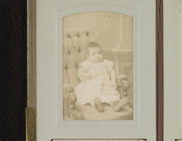 Editor: Here we have "Portret van een baby" created sometime between 1880 and 1910 by V.d. Berg, using albumen print photography. The photo has this kind of stiff formality to it. How would you interpret it? Curator: This albumen print captures more than just a baby's likeness; it documents the early industrialization of portraiture. Consider the shift in photographic production – from slow, individualized processes to more efficient methods using materials manufactured on a mass scale. The paper, the chemicals, the very act of mass producing these images, democratized access to portraiture, shifting it from a luxury of the elite to something accessible to the burgeoning middle class. It also says a lot about labor conditions at the time, what were the processes for women doing photography at this time? Editor: So, the emphasis on mass production made portraiture more common, interesting. Curator: Exactly. The rise of the middle class demanded affordable ways to create family memory. And the creation of albumen paper and increasingly efficient studio practices fulfilled that demand, though frequently relying on exploited labor. Notice the details - the clothing. Do you know how many women were needed to take care of dressing babies and kids from privileged families in that epoch? What is also crucial, is that as the industry professionalized it allowed women to earn wages, in contrast to working for family. Editor: That gives me a lot to think about about regarding social class and technology! I hadn't considered the industry side of photography from that era. Curator: Indeed. Examining these processes of creation and consumption reveals so much about the society and economy of the late 19th century, it reframes our relationship with photography beyond just recording visual facts.