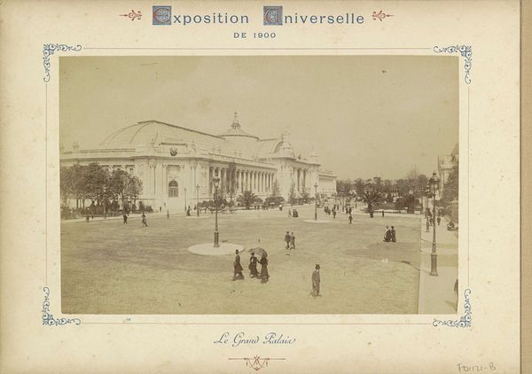 Curator: Today we're looking at a photograph by Neurdein Frères, taken in 1900. It's titled "Exterieur van het Petit Palais in Parijs," capturing the Petit Palais from an exterior vantage point. Editor: It has a quiet grandeur to it, a stately elegance captured in sepia tones. The perspective draws you into the building's facade, the architecture asserting itself. Curator: Absolutely. The photograph showcases the Petit Palais during the Exposition Universelle, highlighting its Neoclassical design. Notice how Neurdein Frères frame the building, emphasizing the symmetry and balance characteristic of this style. The columns, the dome, and the carefully arranged statues—every element adheres to classical principles of order and harmony. Editor: And the people give a sense of scale. The building, impressive as it is, blends with the life of the city through the visitors populating the scene. Beyond architecture, it is capturing a moment, and this photo becomes a symbol of progress, civilization and the optimism of that time. The figures moving across the frame look as though they belong to a stage in a performance of modern life. Curator: Precisely. Considering that photographs, particularly architectural studies such as this one, sought to classify and monumentalize its motifs, could it be suggested that it does this too? In that the meticulous placement of these individuals, some perhaps consciously placed in that position, adds to the feeling of order? Editor: It brings into question ideas of photographic intention, and its ability to accurately record life as it happens without embellishment. However, regardless of photographic veracity, I do feel the photograph offers itself as a celebration of modernity and progress in this time, so for me it still functions beyond architecture, acting as an emotional document that captures the dreams of the age. Curator: That’s a thought-provoking idea. Regardless, the photograph certainly encourages further analysis of space, intent, and its relationship to photographic practice. Editor: Yes, each element invites consideration. The image evokes many ideas beyond what at first seems like an architectural photograph.