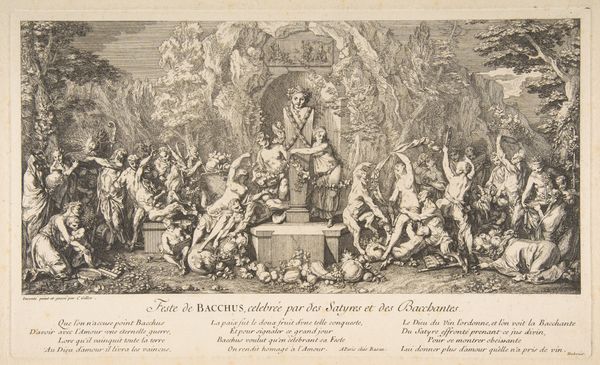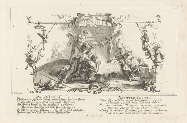 Curator: This engraving, crafted sometime between 1719 and 1727, is Johann Christoph Steinberger's rendition of the "Adoration of the Magi," currently housed at the Rijksmuseum. The style very clearly demonstrates Baroque influences. What are your initial impressions? Editor: Baroque! It feels less grandiose than I’d expect, almost delicate. The lines are so fine, creating this swirling energy around the central scene. But, wow, there’s a lot going on here. Like, cherubs with telescopes... are they actually spying on the holy family? Curator: Perhaps 'observing' is a better term than 'spying.' Telescopes at this time symbolized a new scientific worldview coinciding with religious beliefs, not necessarily conflicting but enriching each other. Consider, too, that Epiphany signifies revelation and illumination—knowledge emerging from the divine, even as filtered through human invention. Editor: Mmm, okay. I’m still caught on the angel carrying the star. It’s positioned like…a spotlight? A heavenly PR agent? It gives the image an almost theatrical feel, right? Stagecraft, divine narrative, the whole shebang! Curator: Absolutely! The star itself represents fulfillment of prophecy—the convergence of astrological signs and divine promise, a common Baroque trope in historical paintings and engravings. Notice the ornate frame intertwined within the central image. How does this add to the central meaning? Editor: That intertwining feels key! It binds the terrestrial, represented by those grounded wise men, with the celestial spectacle happening above. It suggests that no matter our earthly struggles and limitations, we're always part of this larger cosmic play, witnessed and maybe even gently nudged along by the heavens. It’s almost comforting, in a busy, baroque sort of way. Curator: It does weave together multiple dimensions. Ultimately, Steinberger uses visual symbolism to reinforce this very baroque concept that faith is revealed and discovered simultaneously across time and space, as history and knowledge continually evolves. Editor: Nicely said. Well, I initially saw the engraving as crowded and slightly bizarre. Now I see it as… deliberately intricate and strangely hopeful. Curator: Indeed, a new understanding gained by thoughtful looking and reflection.