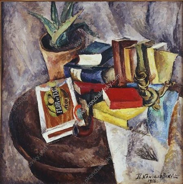 Curator: Looking at Pyotr Konchalovsky’s “Still Life. Scales.” from 1916, painted with oil on canvas, what are your immediate thoughts? Editor: It feels a bit claustrophobic, doesn't it? All these objects crammed onto a single plane. There’s a real sense of domestic intimacy here, but also of something slightly oppressive. Curator: Absolutely. The intimacy stems from the iconography of everyday bourgeois life: the books representing knowledge, the scales perhaps justice or balance, the chessboard gamesmanship... Editor: ...and social positioning, absolutely. I wonder what prompted him to include the scales specifically during 1916. War raging across Europe, Tsarist Russia teetering… was Konchalovsky hinting at a world dangerously off-balance? Was this piece politically charged? Curator: It's possible. In terms of artistic currents, though, the flattening of the picture plane and use of geometric forms does show an influence from the Russian avant-garde movement during that period, certainly. However, Konchalovsky retained a grounding in Realism. Editor: That's right, and I see how the influence manifests. Those slightly warped perspective, the visible brushstrokes… it’s a fascinating tension. Curator: It is, especially as those everyday objects, like the candlestick, possess weight beyond their simple function. They gain metaphorical meaning due to their composition. I perceive this painting as a visual inventory of bourgeois stability at a point of imminent fracture. The choice of the scales underscores this uncertainty, the need to balance or weigh impending consequences. Editor: That makes perfect sense when one sees it in the wider framework of the time. Thanks for guiding us. Curator: Thank you. This painting feels surprisingly potent after delving into its possible contexts.