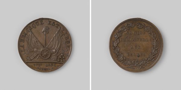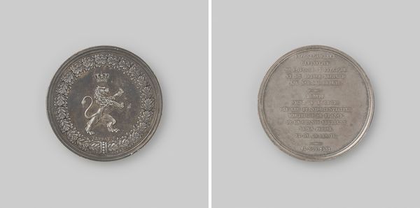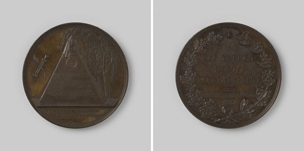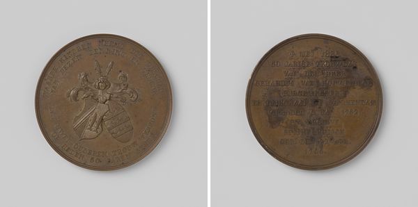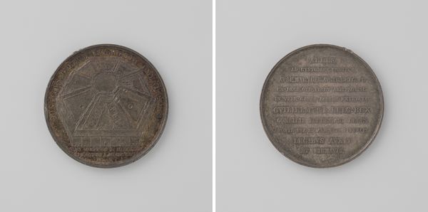 Curator: Here we have Willem Schammer’s metal print commemorating the 250th anniversary of the University of Utrecht, created in 1886. Editor: It feels quite formal, doesn't it? Solid and rather weighty, like something presented at an official ceremony. I'm immediately drawn to the tactile quality – I wonder about the labor involved in its production and circulation at the time. Curator: The imagery certainly reflects that sense of formality. The central figure appears to be an allegorical representation of Justice, standing between heraldic shields, framed within rays of light—perhaps symbolizing the enlightening role of the university itself. Note the Latin inscription at the top. Editor: Right. “Iustitia,” the personification of justice. So, thinking about the materiality, bronze or a similar metal would've been chosen deliberately, suggesting permanence and value, like an official seal. Was this a large-scale production, or a limited commemorative run? Curator: It was likely produced in some quantity for distribution amongst dignitaries, alumni, and other associated figures with the university. These kinds of commemorative medals serve to codify and materialize significant events. Editor: And what kind of socio-political statement does it make? The emphasis on the institution's long history reinforces a sense of enduring authority. Who, exactly, was this aimed at convincing, and what narratives was it meant to cement? Curator: It's certainly a statement of institutional pride, looking backward in history to legitimate present-day authority and, one hopes, looking forward to continuing prosperity. Symbols play a significant role in establishing the legacy and ideals of an institution like a University. Justice, truth, enlightenment... Editor: And the choice of materials, that industrial-age bronze – speaks to the relationship between academic power and economic structures. Something to ponder, even as we move to the next work. Curator: Yes, it serves as a reminder that objects, like memories, are materially grounded and layered with symbolism.