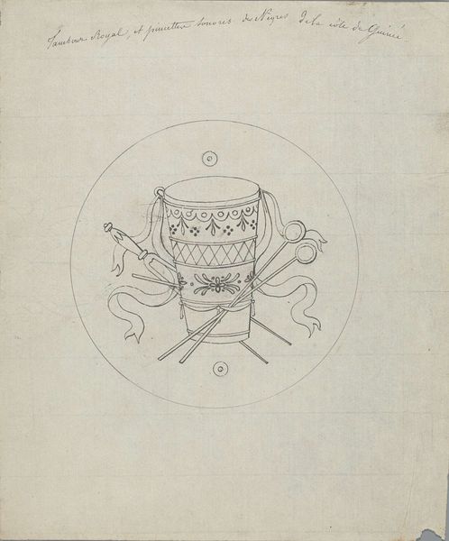Editor: So, this is Pierre Félix van Doren's "Instrument de cuivre, tambour, castagnettes et serinettes Nègres (Côte de Guinee)," created before 1828. It's a drawing, and I see what looks like a collection of musical instruments rendered in ink. The composition, with the circle, makes it look like a crest or an emblem. What do you see in this piece? Curator: It strikes me as a fascinating, albeit troubling, artifact of its time. The title alone, with its use of "Nègres," immediately signals the problematic colonial gaze at play. We have to consider this image within the context of 19th-century European perceptions of Africa. It depicts instruments – drum, castanets – presumably encountered on the Guinea Coast, but they are presented almost as trophies or curiosities, devoid of their cultural significance. Editor: Trophies? I see what you mean. The way they're arranged feels more like a still life than a celebration of culture. Curator: Precisely. And what's absent is just as telling as what's present. Where are the people playing these instruments? Where is the vibrant musical tradition these objects represent? It's a representation *about* a culture, not *of* a culture. It flattens and objectifies. Does it bring to mind similar artworks we've discussed that further perpetuate damaging, dehumanizing views? Editor: It makes me think of how often non-Western art was – and sometimes still is – presented in museums without proper context, stripping it of its meaning and power. Curator: Exactly! This sketch serves as a potent reminder of the power dynamics inherent in representation and the urgent need for critical engagement with historical material. We must continue working to provide more accurate and sensitive frameworks for art historical analysis. Editor: This really changes how I see it. It's more than just a sketch of instruments; it's a document reflecting a very specific and biased worldview. Thank you.