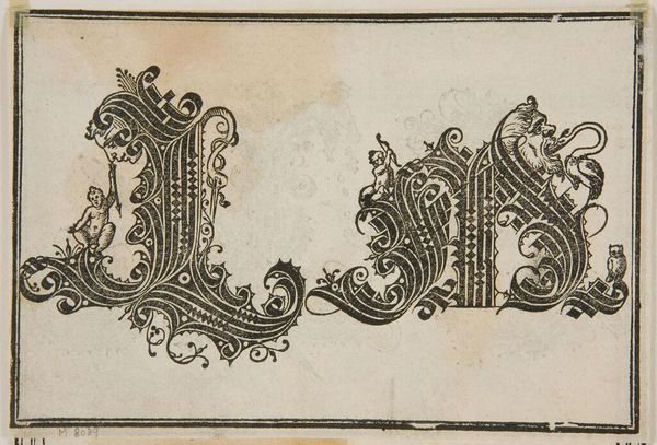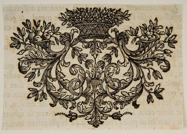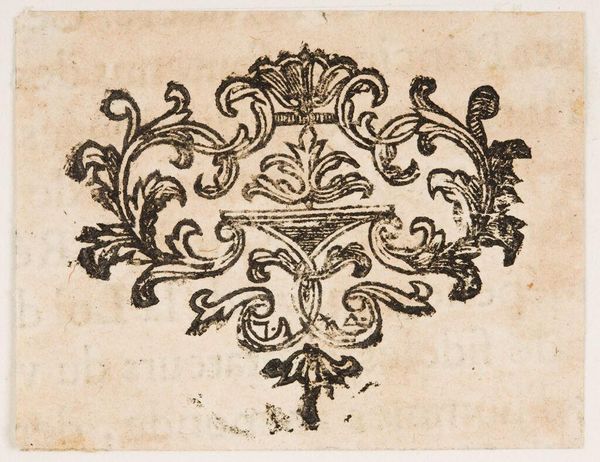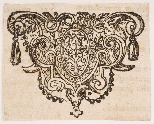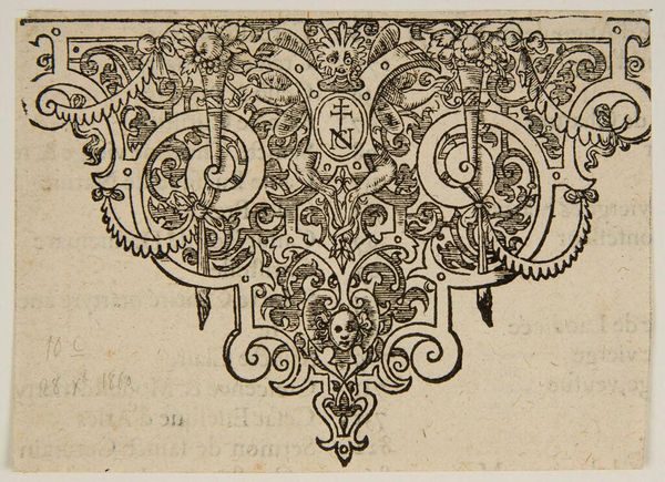 Curator: Here we have "Piece IV," an intriguing anonymous work currently held in the Harvard Art Museums. What strikes you first about it? Editor: It’s visually quite dense, almost gothic, with a strange juxtaposition of playful cherubic faces and unsettling symbolic objects. Curator: Absolutely. The printing process itself is key; this level of intricate detail, achieved through what was likely woodcut or engraving, speaks to a skilled artisan and the labor invested. It's reproducible but hardly mass-produced, retaining a crafted quality. Editor: I am particularly drawn to the central skull motif, framed by swirling patterns. It carries a potent symbolic weight, perhaps a memento mori subtly incorporated into what seems a decorative design. Curator: Indeed. The very placement of these symbols within the design suggests a world where beauty and mortality are inextricably intertwined, reminding us of life's ephemeral nature. Editor: Thinking about it, the craftsmanship involved elevates it beyond mere decoration. The artist imbues common materials with layers of meaning. Curator: A convergence of skill, material, and symbolic language makes for a compelling piece of art. Editor: Yes, a fascinating object that seems to whisper to us across time.