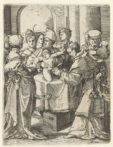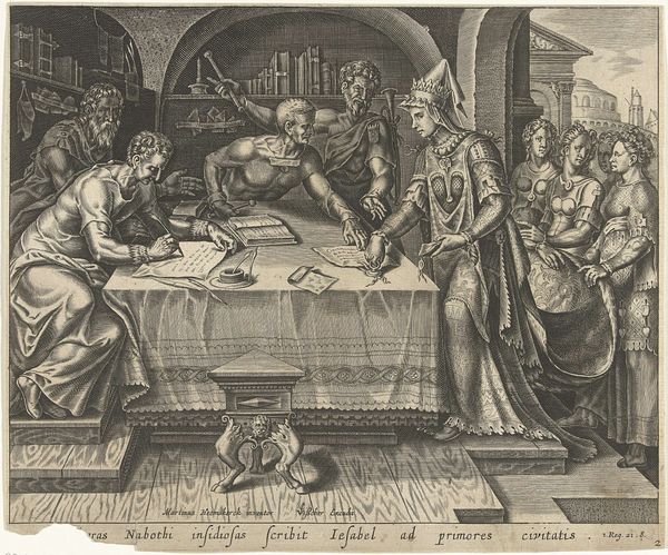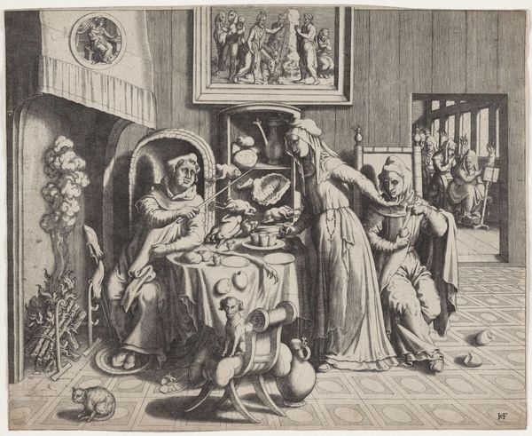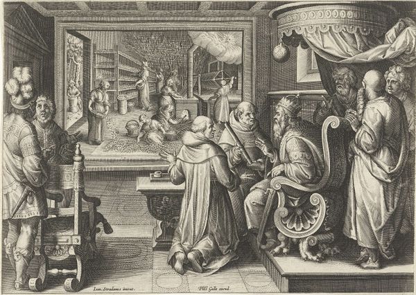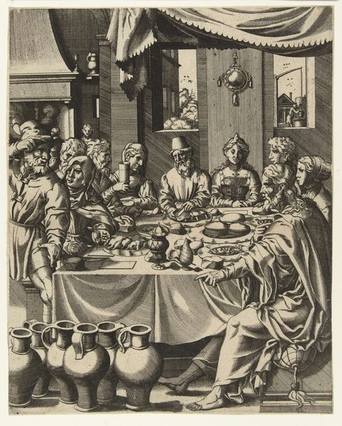 Curator: Welcome. Before us is "Dance of Salome," an engraving by Hans Liefrinck, dating from around 1553 to 1558. It is currently housed here at the Rijksmuseum. Editor: Immediately, I'm struck by the textures rendered here. The density of lines! It creates a somber, almost oppressive atmosphere despite depicting a dance. It looks so laborious. Curator: Indeed. It's a quintessential example of Northern Mannerism, a period deeply influenced by narrative painting. Liefrinck uses the engraving to depict a biblical scene with highly stylized figures, reflecting a period of religious and political turbulence. Editor: I see the craftsmanship, but consider how these engravings were disseminated. This wasn't merely art for art's sake. Prints democratized access to these biblical narratives. Who owned the press? Who controlled the image, and therefore the story? The material object speaks of distribution and control. Curator: Precisely! Liefrinck's choice to represent this particular moment, Salome's dance leading to John the Baptist's beheading, reflects the era's obsession with complex moral questions. This image circulated among different social classes. Editor: And the detail suggests that these weren't quickly made commodities. Think of the labor, the care! The intricate lines rendering fabric, the very subtle suggestions of light and shadow. Someone clearly took pride in this… and profited from it. Curator: Also notice the theatrical composition, a hallmark of Mannerism. The figures are deliberately arranged, with Salome presented as the focal point, a dancer, yet somehow an instrument of fate, an object whose presentation by the artist tells a story about women, power, and the court. Editor: And, look, even the tableware reflects prosperity. Engraved scenes of plenty accompany this grim event; how are the means of production, of the artist’s livelihood, linked to the drama presented? I like the visual story implied between these things, because no element here exists on its own. Curator: Exactly. This work speaks volumes about the political landscape, offering viewers both moral instruction and social commentary in a highly stylized visual language. Editor: I am taking away so many thoughts. Beyond religious story is evidence of working, production and distribution. It has real value beyond its message!