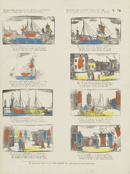 Curator: Welcome, everyone, to our exploration of "De nijvre haringvangst…", an engraving dating from around 1822-1870 and held here at the Rijksmuseum. Its anonymous creation speaks volumes about the values promoted through printed imagery of the period. Editor: Wow, okay, first impression? It's kinda like a comic strip...but preachy? These little scenes, like, 'work hard, kids!' or something? Not exactly giving me the feels, visually. Curator: Indeed, it presents vignettes related to the herring fishery and cityscape, intended to be educational and inspirational. Notice how each scene pairs an image with rhyming verses beneath. It’s a clear instance of using art for didactic purposes. Editor: The colors are wild, aren’t they? Like someone scribbled in the lines with crayons. Intentional naiveté maybe? It gives it a folky, mass-produced vibe, which kinda tracks with the "educational message" angle. Makes it seem, you know, 'art for the common folk'. Curator: Precisely. Printmaking allowed for wider distribution, embedding societal ideals within the everyday lives of the populace. It subtly reinforces social order and patriotic sentiment. Consider the work not only for its aesthetics, but its function within early 19th-century Dutch society. Editor: Right. Like propaganda lite. Less about "this ruler is amazing" and more about "fish makes Holland great!" You know, the subtle art of making capitalism feel good, through catchy rhymes and boat drawings. I find it both unsettling and weirdly charming. Curator: A balanced reaction, I think. This work isn't attempting grand artistic statements. It's attempting something potentially more powerful: to subtly shape a culture. Editor: Which, I guess, makes you look at little picture in a totally different way, huh? More than meets the eye. Curator: Indeed, every artistic piece can open the doorway into understanding the wider world. Editor: I will certainly look twice at colorful, vintage comic strips from now.