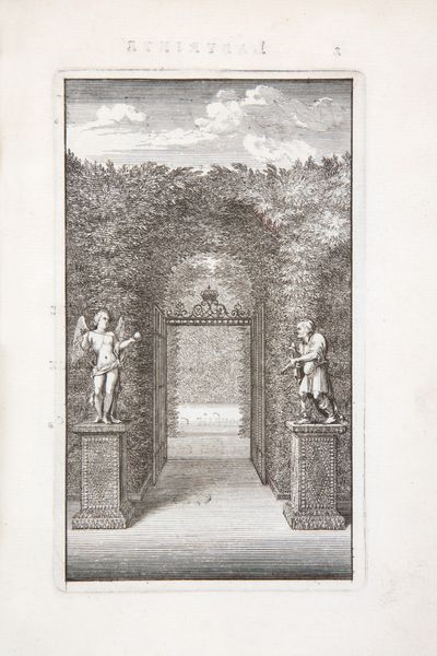 Editor: This is "Eerste poort van de groote laan op landgoed Clingendael," an engraving by Daniël Stopendaal, likely from between 1682 and 1746. It depicts a grand gateway in a park. I find the perspective very striking; it almost draws you right into the scene. What can you tell me about it? Curator: This engraving is fascinating because it captures a specific vision of Dutch identity through landscape and the constructed environment. These formal gardens and imposing gateways, meticulously rendered, signal the control and order favored by the Dutch elite. This isn’t just about portraying nature; it’s about shaping and displaying it in a way that reinforces social hierarchy and political power. How do you think this image would function for its original audience? Editor: I suppose it would be a status symbol, a way to flaunt their wealth and refinement. Is there any symbolism we can identify in the depiction? Curator: Precisely. The architecture, inspired by Baroque ideals, hints at aspiration towards the international cultural scene while grounding it within a distinctly Dutch context. The presence of figures leisurely passing through also hints at a cultivated life. We might ask ourselves, who was this image for? Who had access to Clingendael and representations of it? Editor: It is a subtle but effective form of propaganda. So this print circulated to a specific audience and served specific political aims through its visual depiction. Curator: Exactly. By examining this image, we uncover how landscape becomes a stage for power, designed for both display and social influence. Consider how such idealized imagery played a part in shaping public perception. Editor: I never thought of landscapes being that political before. It has been really illuminating, thank you!