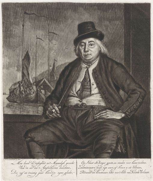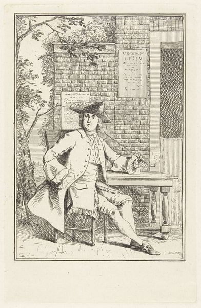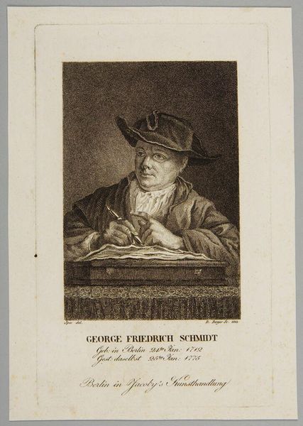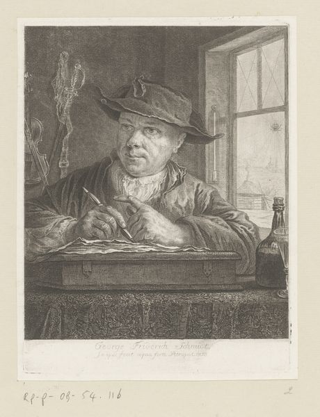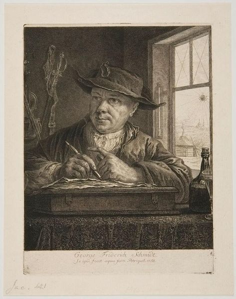 Editor: Here we have Georg Friedrich Schmidt's self-portrait. Looking at this etching, there is a lot of texture and detail. What stories do you think his image is trying to tell? Curator: Ah, yes. It’s more than just a likeness, isn't it? Look at the objects around him – the tools of his trade, that cheeky bottle of…inspiration? It's as if he’s inviting us into his creative den, his mind even! Editor: So, it's less about vanity and more about artistic identity? Curator: Precisely! Each element seems deliberately placed, a clue to his artistic soul. What do you make of the window? Editor: It gives him some much-needed lighting, but also provides a nice connection to nature. I hadn't considered the symbolism here. Thank you!