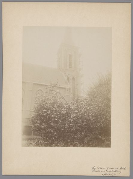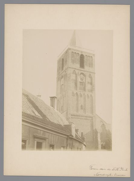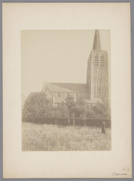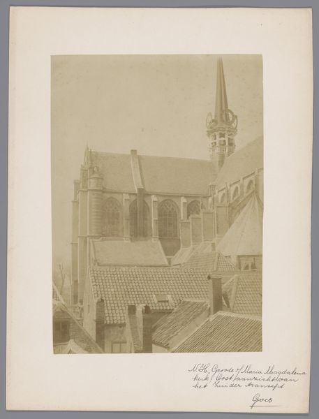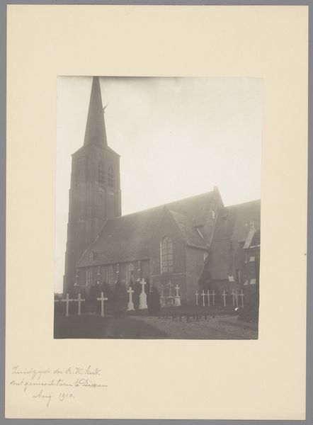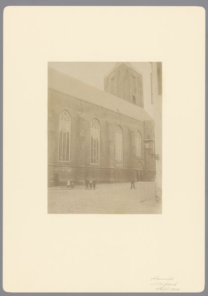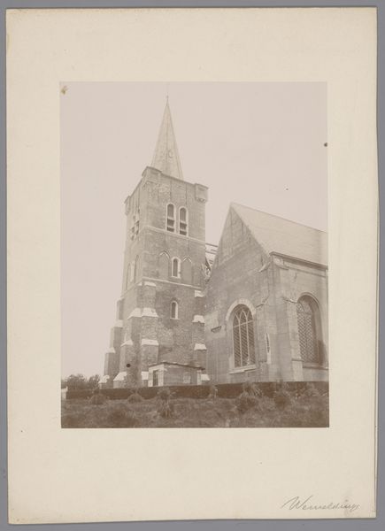 Curator: Here we have an anonymous photograph from 1902, titled "Grote of Sint-Nicolaaskerk te Monnickendam," depicting the grand church of St. Nicholas in Monnickendam. Editor: It’s certainly imposing. I'm struck by the solemnity; it feels monumental and stark against what I imagine to be the muted sky of the Netherlands. The gray scale only amplifies the feeling. Curator: Note how the photographer has chosen the angle. We have a three-quarter view, which allows the eye to travel along the body of the church and appreciate its linear dimension before rising to the great spire. Editor: The architecture, while seemingly stoic in its design, brings forth all sorts of interesting tensions that mirror my own struggles for inclusion in this community. Who had access? What were the conditions? Where were the people allowed, and not allowed? Curator: That’s interesting. Looking at the photograph as an object, one sees the hand of time has touched it physically; there's a subtle fading around the edges, almost like a halo. It calls to mind similar photographs taken at the beginning of architectural preservation movements. Editor: Precisely. And consider, this building wasn’t neutral. These imposing structures legitimized and facilitated religious—and, consequently, social—oppression. Who was centered? Whose values dictated that center? Who did it exclude? Curator: The geometry of the windows against the mass of brick has a very pleasing sense of visual balance. Even in the slightly softened focus, the building is grounded in concrete design, an aesthetic experience if nothing else. Editor: A stark contrast that does capture a pivotal moment, really, even as the artist chose to memorialize the architecture rather than the real and imagined societal cost for said structure. Curator: In essence, whether we look at it aesthetically or through the lens of cultural impact, this image of St. Nicholas’ church prompts a dialogue about space, faith, and representation. Editor: Leaving us to contend with the legacies and structures that still impact communities and spaces today.