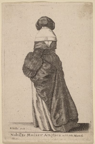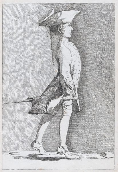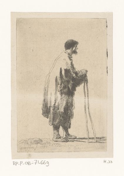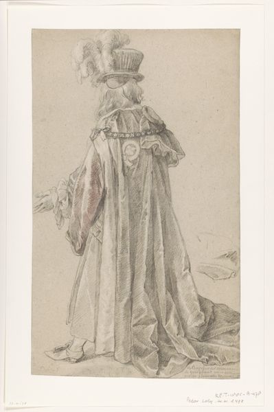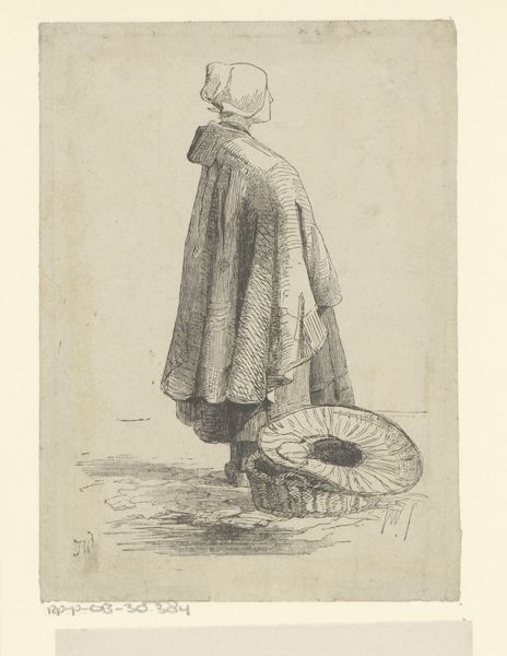 Curator: Ah, let’s pause here for a moment. What do you make of this pencil drawing? It's called "Study of a Standing Woman with a Sheaf of Wheat Under Her Arm," created sometime between 1807 and 1861 by Cornelis Steffelaar. Editor: Immediately, I'm drawn to the stark simplicity. It’s the bare feet, the heavy wheat...you can feel the weight, not just of the sheaf, but of labor, of necessity etched into the gray paper. The social reality screams through what’s materially represented, don’t you think? Curator: Absolutely. I feel an intimacy too. It’s like catching a fleeting moment. Her back is turned, and yet I sense a world of stories in that simple posture, the humble materials reflecting the nobility and beauty in ordinary working life. There's a vulnerability, perhaps? Editor: I’d agree with nobility, not in some grand romantic gesture, but the hard, thankless variety. Look at the rendering—a soft, forgiving pencil that attempts to elevate that. To what extent is this labor romanticized I wonder? I can see the blending of the fine and applied arts. It makes me consider who this drawing was made for. Curator: An intriguing question. I feel Steffelaar has found some profundity through quite gentle applications of a mundane medium on a pale plane. Editor: Indeed, and isn't it that contrast between labor and medium the artist attempts to disrupt through its formal qualities, such as the direction of her back facing away from the viewer? A symbolic choice given the back-breaking toil. A question that begs to be asked in my mind is this object purely art or instruction? What social and labor realities do the material and style speak to here? Curator: Fascinating. I feel you’ve given me much to contemplate there! This drawing continues to teach us new lessons upon each look. Editor: And vice-versa, given our contrasting lenses. The history of art making comes to life from many diverse interpretations.