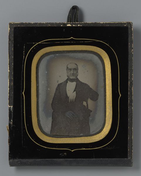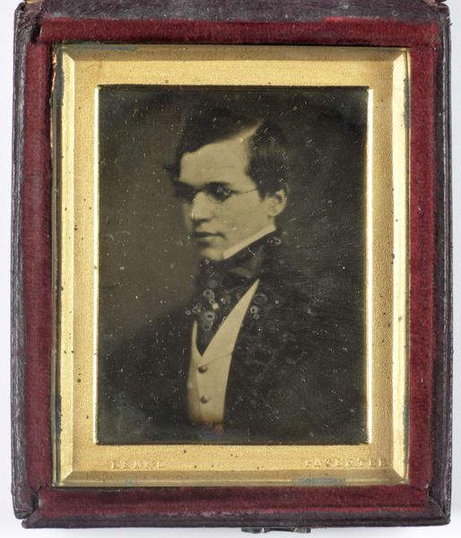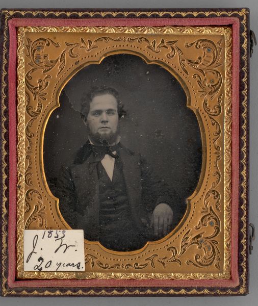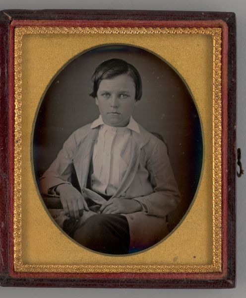 Editor: This is a daguerreotype, an early photographic process, by James Presley Ball, Sr., titled "Untitled (mixed race boy)." It’s quite small, only about 9 by 8 centimeters. I'm struck by the boy's formal attire and serious expression. What can you tell me about the symbols at play here? Curator: The formality is key. The dark suit and bow tie, even the pose, speak to aspirations and a desire for respectability during a time of great racial prejudice. The visible hand is relaxed, but holding a ring, a symbol of status and achievement. Ball subtly challenges racial stereotypes. Editor: So the image is less about the individual and more about what he represents? Curator: Precisely. It's about crafting an identity, a visual statement of dignity in a society that often denied it. Do you see how Ball uses light and shadow? Editor: Yes, the light highlights the boy's face. I see how the artist focuses on him, rather than any distracting background. Curator: These choices reinforce the message of the young man's worth, his potential. Editor: I didn’t realize how much meaning could be packed into such a small image! Curator: Indeed. It’s a powerful testament to the enduring human spirit.