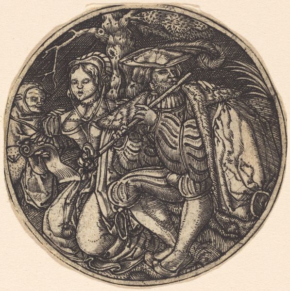 Editor: Here we have an engraving, "Bagpipe Player with His Lover," created by Master I.B., likely sometime in the Medieval period. There's an immediate sense of intimacy, the figures nestled together under a tree. What layers do you see beneath this seemingly simple scene? Curator: The bagpipe itself is a loaded symbol. Its drone has long been associated with the primal, with celebration, even carnality. Notice the way he looks at her, not at his instrument. The music here serves as a subtle backdrop to the real drama: the charged space between them. What do you think the inclusion of that large blade implies about the bagpipe player? Editor: Perhaps it’s a class indicator, suggesting he's a woodsman or huntsman. Or is it meant to imply some type of potential violence? Curator: Both readings hold merit. Think about medieval courtship rituals. Music and gifts were often bartered, displayed in pursuit. Yet, societal rules were strict, particularly concerning female virtue. This blade represents that razor's edge—the tension between desire and the potential for societal transgression. The artist encodes a complex relationship dynamic using just a few key objects. Editor: It's amazing how much unspoken narrative the artist is able to build. I had initially missed a lot of the subtext, and it's striking how effectively objects like the blade and the instrument themselves play as symbols here. Curator: Indeed, the artist's reliance on cultural symbols grants "Bagpipe Player with His Lover" a weight that speaks to a broader medieval culture, revealing the anxieties and values around love and transgression that remain relevant today.
