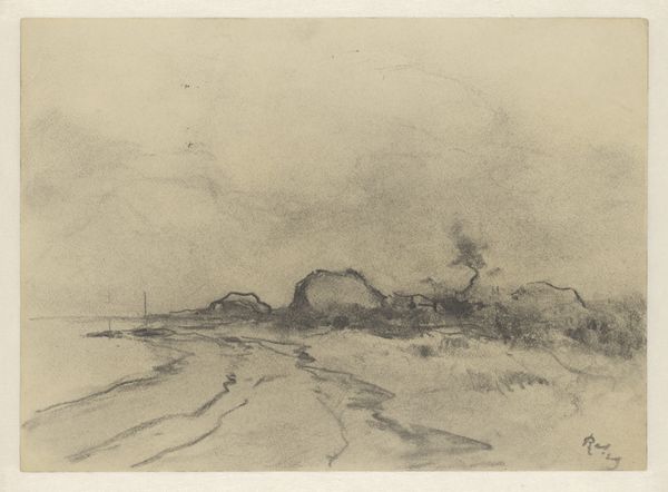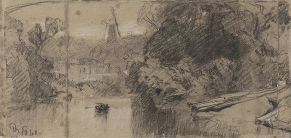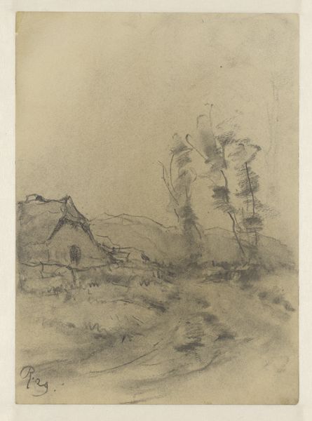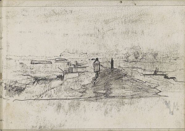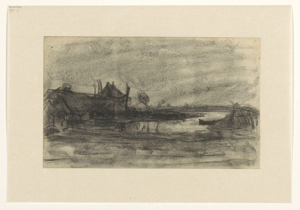 Curator: Pieter Ras's "Farms along a Ditch," created in 1929, presents a subdued rural scene. This piece from the Rijksmuseum collection primarily utilizes pencil and graphite on paper, showcasing a tranquil landscape. Editor: Well, my first impression is this almost feels like a memory. Faded somehow. The whole scene has a quiet sadness to it, like the stillness just before a storm rolls in. That lone boat sitting there, it’s got a melancholy about it, don’t you think? Curator: Precisely. The success of the piece hinges on its masterful tonal control. Note how Ras employs subtle gradations of graphite to establish depth and atmosphere. The strategic use of light and shadow draws attention to compositional elements and simultaneously conveys a sense of placidity. Editor: It's true, the limited use of contrast creates a sense of atmosphere, like looking through a veil. It isn't particularly detailed either, the building and the trees are merely gestural. Is this some sort of symbolism in action or simply lack of detail in a sketch? Curator: A formalist interpretation could suggest the emphasis is not on realistic representation, but on capturing the essence of the landscape. Ras seems to be evoking emotion rather than documenting reality. His technique here relies on the viewer to fill in the blanks, thus participating in the completion of the work's meaning. Editor: I buy that, this incomplete look really emphasizes that dreamlike atmosphere I was talking about. Sort of a hazy countryside, softened by time and the artist's unique lens. The more I consider it, the more it has captured something both somber and strangely peaceful. It almost tempts you to get in that boat, even knowing where it will take you may be a mystery. Curator: Ultimately, this piece encapsulates Ras's facility with light, texture and compositional balance, all working together to evoke a mood that persists long after you turn away. Editor: Right, so maybe not just a sketch then, but a distillation. I get it, now, a ghostly glimpse. Thanks for illuminating the dark edges.
