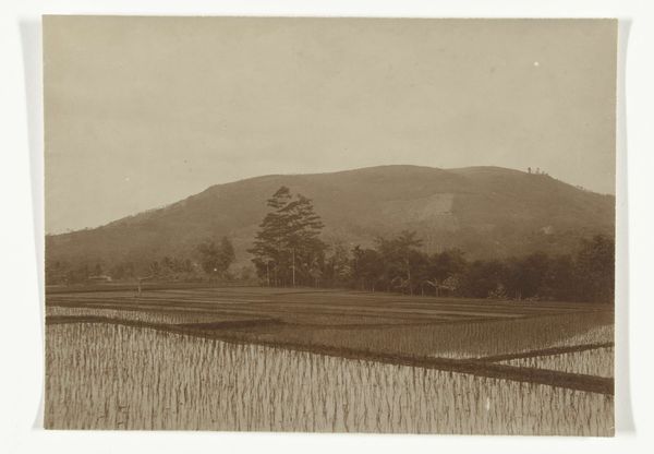 Editor: This is a photograph entitled "Sawah met rijstplanters, Nederlands-Indië" taken sometime between 1895 and 1915. The image shows a group of figures, presumably rice planters, working in a flooded field against a mountainous backdrop. The whole scene has this rather subdued, almost melancholic tone. What stands out to you as you examine this photograph? Curator: It is interesting to note how water acts as both a physical element and a mirror reflecting the symbolic connection between humans and nature, almost like a baptismal rite, evoking both serenity and labour. Water’s fluidity reminds us that change and adaptability are perpetual and are themes often associated with images of agriculture. In what ways does this idea of fluidity connect with what you initially observed? Editor: Well, the "melancholic" mood, I think, is linked to seeing these figures working within that context of immense natural power; it feels very timeless, but also points to human vulnerability. Does that resonate with the symbolism you see? Curator: Absolutely. Look at the subtle gestures captured—each body bent in repetitive motion. These stances mirror archetypal gestures that represent perseverance. And note the angle, almost anthropological, perhaps? The composition doesn’t idealize but presents labor as part of the broader cultural narrative. It echoes historical accounts while adding dignity. What further stories do you feel it tells? Editor: Considering its age, the photograph acts almost like a window into the past. It captures not just a scene, but a moment in a cultural landscape that feels distant, almost dreamlike, now. I hadn’t really thought of the photograph itself acting like an icon. Curator: Exactly. In its visual storytelling, this piece invites introspection about our own relationship with labour, history, and the land.