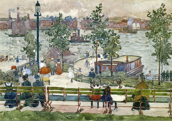 Editor: Okay, so we’re looking at Maurice Prendergast’s "Excursionists, Nahant," from 1897, a watercolor that just… breaths with this quiet energy. There’s so much happening, yet it feels so calm. What do you see in this piece, that maybe I’m missing? Curator: Ah, Prendergast! He truly captured the poetry of leisure. It’s a delicious layering of moments, isn’t it? I’m instantly drawn to how he collapses space – that wonderful flattening effect. It's like a dream slightly out of focus, capturing a collective memory rather than a precise scene. Notice how he uses watercolor almost like confetti, scattering these tiny dabs of color to create the illusion of a bustling day by the sea. Don't you feel almost a touch of James Ensor's playfulness here, mixed with the very distinct air of American Impressionism? Editor: Confetti, that's a great way to put it! I was so focused on the overall scene I didn’t really register those dabs individually. You know, looking at it now, the color feels almost… nostalgic? Like a faded postcard. Curator: Precisely! Prendergast isn't just showing us a scene; he's evoking a feeling, a moment in time that feels both immediate and incredibly distant. That’s the magic of memory, isn’t it? How does the subject make *you* feel? Editor: Definitely like a hazy memory. I think seeing the American flag kind of waving makes it a specific memory, but seeing it all soft and watery blurs it out to be every memory. That's really beautiful. I appreciate that insight. Curator: And I love your reading of the flag as a personal *and* collective symbol! It makes one consider art's uncanny capacity to be intensely subjective and historically relevant at the same time. Thanks for pointing that out!
