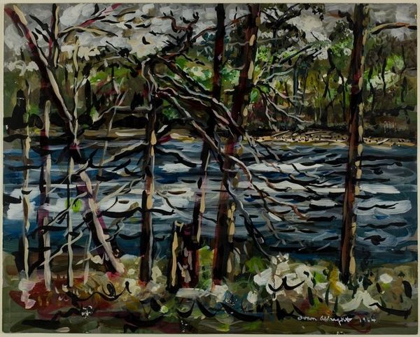 Editor: So, this is Ivan Albright’s “St. Mary's Black River is Blue, Georgia” from 1964. It's an oil painting and the blue of the river dominates everything. It almost feels... turbulent, even though it’s just a landscape. What do you see in this piece? Curator: I see the echoes of myth and cultural memory embedded within what seems like a simple landscape. Albright presents us with a river, but it's not merely water; it is a symbolic pathway, a visual metaphor for time and transformation. What feelings does the colour evoke in you? Editor: The blue does give a sense of depth but the way it's painted makes it almost aggressive. Like the river is overwhelming the banks on either side. Curator: Precisely. Colour choices act as triggers for certain emotional and psychological states. Here, the artist juxtaposes the potentially soothing effect of the blue with brushstrokes that introduce dynamism and tension. Do you see any recurring shapes or symbols? Editor: Now that you mention it, the wave-like brushstrokes of the river are repeated in the clouds. Is that intentional? Curator: I believe so. Water, in many traditions, is seen as a symbol of both destruction and purification, chaos and creation. Albright might be suggesting that the river—like memory itself—is constantly in flux, shaping and reshaping our understanding of the world. These shapes tell us of cycles of transformation and endurance over time. The forest and river's edge feel very active in this piece, almost like it has a spirit or will of its own. What does that communicate, do you think? Editor: Maybe the painting speaks to a world larger than human presence, reminding us that nature has a cycle of its own that we can only partly influence or know? I see that a lot more clearly now. Curator: Indeed, reflecting upon visual symbolism, we reveal how images carry meaning and emotional weight across time, even within a seemingly straightforward landscape. Editor: I’ll never look at a river the same way again.