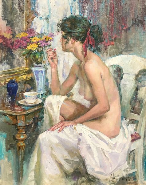 Editor: This is John Michael Carter's "Studio Arrangement," an oil painting. I’m immediately struck by its intimacy. It feels very private, like stepping into a stolen moment. What do you see in this piece, beyond just a glimpse into an artist's studio? Curator: The studio itself becomes a canvas for interpreting inner states, doesn’t it? Notice the way light pools and scatters – a classical trope – over the reclining figure, yet consider how it departs from, say, Ingres’ odalisques. What familiar symbols are being reshaped here, to suggest not mere sensual display, but something more akin to reverie or perhaps self-possession? Editor: Self-possession, I like that. The cat adds another layer, a sense of watchful companionship, but it’s almost… sphinx-like in its posture. Is it guarding her thoughts? Curator: Precisely! Think of the cat as a silent guardian of domesticity and a familiar of sorts; a visual rhyme echoing throughout art history and various cultures. This evokes continuity, the passing of stories, perhaps a deeper understanding of feminine experience as mediated through symbolic representation. Is this, then, about visual tradition, lived experience, or some interplay? Editor: It makes you wonder what she's reading. Is it a romance novel, a book of philosophy, or the artist’s statement for the show? This painting poses a lot more questions than it answers, which I think is part of its appeal. Curator: And therein lies its potency! The enduring power of imagery is in this capacity to simultaneously reflect our history and keep its mysteries alive through ever new symbolic interpretation.