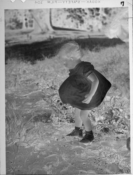 Editor: This silver gelatin print, "Untitled (girl walking in lake)" by Lucian and Mary Brown shows a woman wading into a body of water. The inverted tones lend a dreamlike quality to the scene. What strikes you about the formal aspects of this photograph? Curator: The composition is immediately compelling. The figure, though central, is framed by the complex textures of the water and the ambiguous background. Notice the play between light and shadow, almost a dance, creating depth and pulling the viewer in. Editor: The textures are definitely the most compelling feature. There's such high contrast. Curator: Precisely. The formal arrangement, the careful attention to tonal values, transforms a simple scene into a study of form and light. Editor: I see how the contrast itself becomes a subject! Thanks! Curator: A keen observation! And a vital part of understanding visual language.