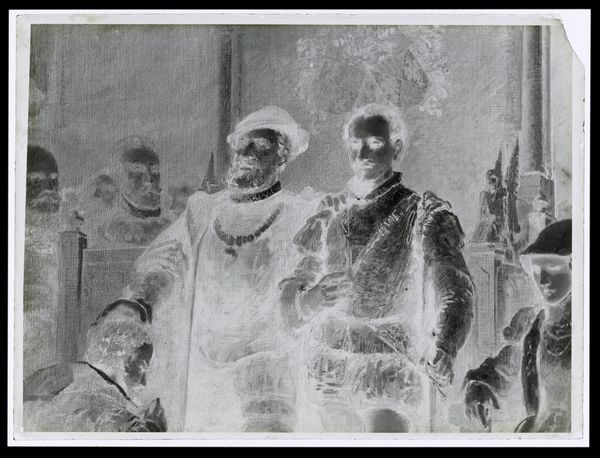 Editor: Here we have a gelatin-silver print dating from around 1865-1900, titled "Fotoreproductie van een detail van een schilderij met een scène uit het leven van Willem van Oranje"—a photographic reproduction of a painting detail showing William of Orange's life. Its ghostly, almost ethereal quality is quite striking. What's your interpretation of this image? Curator: This photographic reproduction speaks volumes about the cultural power of historical narratives, particularly in the 19th century. Consider how William of Orange was constructed as a national hero. This image, in its diffusion, almost mythologizes that figure. We need to ask: what purpose did these representations serve in shaping national identity and power structures at the time? Who was included, and more crucially, who was excluded from this narrative? Editor: That's interesting. So, it's not just about the person depicted, but what they represent, and how that representation might have been used. Is that what you mean? Curator: Exactly. And photography here acts as a tool to disseminate and solidify that specific, selectively crafted narrative. Think about the access, or lack thereof, that various societal groups had to these images, and consequently, to participating in that national identity. Does that altered texture influence your impression? Editor: I see it now. The image's softness makes it feel… distant, like a memory. It almost removes agency from the individuals pictured and highlights the symbolic weight placed on them. Thank you for that perspective. Curator: My pleasure. Ultimately, critically examining how historical figures are presented enables us to comprehend how cultural values were, and continue to be, perpetuated, manipulated, and occasionally, challenged.
