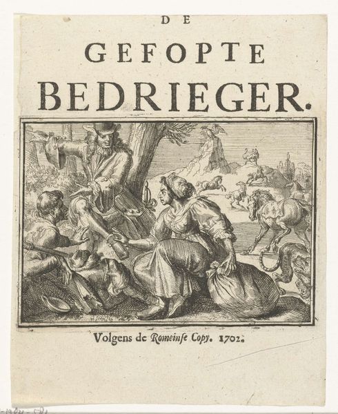 This is a 1702 print by Romeyn de Hooghe, a title page to a pamphlet, rendered with meticulous detail using engraving techniques. The composition is divided into textual and visual sections, creating a hierarchy where the stark lettering leads the eye, and the scene below elaborates on the title's theme. The artwork presents an interior where figures interact with a theatrical display, possibly critiquing contemporary political idolatry. The artist uses sharp lines to define forms, creating a dense network of textures that animate the scene. The linear perspective directs our gaze towards the back where we can see the Latin inscription ‘Creator Regum’, which can be interpreted ironically as an illusion of divine power. The work functions as a semiotic system, where each element—the figures, text, and setting—acts as a signifier in a broader commentary on power and representation. The carefully structured layout of the print and the interplay between text and image encourage us to decode the underlying critique of the era's power structures.