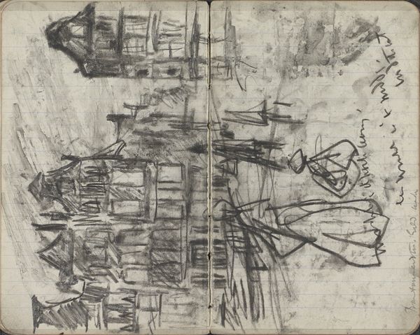 Editor: This is George Hendrik Breitner's "Gezicht op de Overtoom te Amsterdam," from 1907, a drawing held at the Rijksmuseum. It feels so fleeting and unfinished, almost like a memory fading. What stands out to you? Curator: Immediately, the dual-page format compels attention. Breitner leverages the inherent structure of the sketchbook. On the left, the meticulous, if rapid, lines detailing the Overtoom create a strong verticality, which is then starkly contrasted with the diffused and almost ethereal sketch on the right. Notice how the linear precision gives way to a softer, almost ghostly rendition on the facing page. It begs the question: What compositional dialogue is he attempting? Editor: So you're seeing it less as an incomplete sketch and more as a study in contrasts within the same piece? The shift from the definite to the indefinite? Curator: Precisely. Consider the stark differences in line quality, from assertive strokes to barely-there suggestions of form. It isn't simply about recording a view, but perhaps also about capturing the ephemeral nature of perception itself. Breitner manipulates our understanding through varied materiality and form, creating a dynamic, layered visual experience. Do you find any element particularly striking? Editor: The way the lines fade into almost nothing on the right page is interesting. It really does make the drawing feel like it is disappearing. Thank you, I will definitely see sketches with fresh eyes after this. Curator: Indeed. Paying close attention to compositional elements, the manipulation of form, line, and even the very surface on which an artwork is created, can unlock significant meaning.