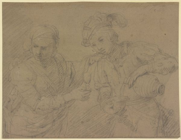 Curator: This is a drawing by Eustache Le Sueur, titled "A Judge and Two Gentlemen Lawyers." Look at these figures, captured with a delicate touch on toned paper, seemingly in mid-conversation, perhaps deeply pondering the implications of the law itself. Editor: Immediately, I’m drawn to the impermanence of it all, the sense of figures caught in a fleeting thought. It feels almost like witnessing a memory fade – soft lines, incomplete, a little hazy, like they could vanish if you looked away. Curator: Exactly. It’s the kind of sketch you might find tucked away in a personal sketchbook. Le Sueur experiments with light pencil work here, isn’t he? Capturing gesture more than concrete form, the sketchiness enhances the impression of a candid, unstaged moment. There’s no pretense to grandiosity, despite their formal roles, or is that because this is an internal thought? Editor: Or is it a peek into the performance of power? I wonder how deliberate Le Sueur's style choice was. Showing justice itself as unfixed, as a matter of perspective and... well, a little bit of fudging- could Le Sueur have intended something more daring than a quick practice? There's a deliberate quality about that leftmost figure... his body cloaked in the trappings of power. He turns away to avoid any messy, real connection, doesn’t he? Curator: Possibly. Remember that images of power, or images relating to the judicial system often operated through implied visual codes and subtle subversions. The legal world relied as much on perception and presentation as it did on strict interpretation of the law. Editor: Yes, there’s almost a theatricality. And maybe, Le Sueur’s style choices themselves become part of this performance, underscoring just how slippery, even subjective, authority can be when presented to the world. I keep wanting to dive beneath those quick strokes, hoping they lead somewhere absolute. Curator: And yet the absence of such absolutes may well be the point. Thanks to the drawing, it shows the fragility of judgment... so susceptible to light, shadow, and fleeting human gestures. A legal world based on anything BUT the black and white it sells to the masses. Editor: What I will keep from this image is the sense of capturing not the definition, but the feeling of legal discussions - full of gray areas and half-finished ideas, rendered in this delicate dance of light and shadow. Curator: A potent reminder that behind every seemingly impenetrable judgment, a mess of debate that needs to come to terms before action and consequence is dealt with, or not.