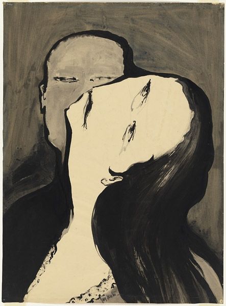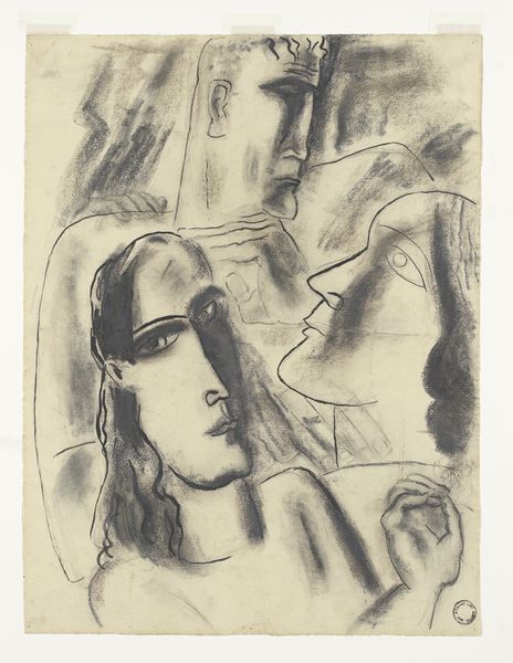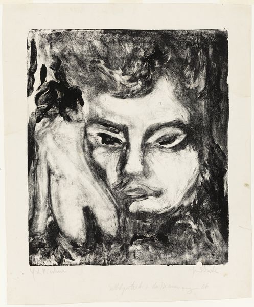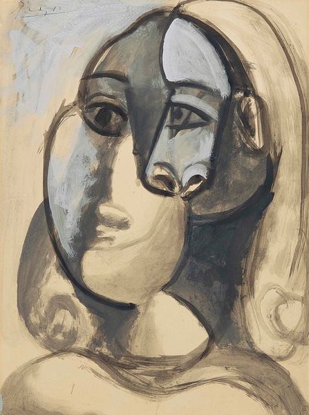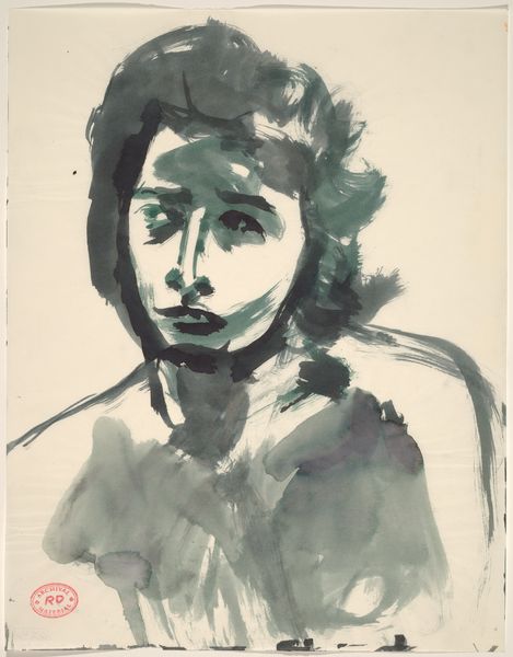 Editor: This is an untitled ink drawing from 1949 by Joy Hester. It has such an interesting feel, the loose lines giving the portrait a raw, almost unfinished quality. What can you tell me about how the artistic elements contribute to the work's overall impact? Curator: I note primarily the tension between figuration and abstraction in this piece. Consider how the recognizable elements of the face – the eye, the line of the mouth – are rendered with such minimal detail. The expressive quality emerges less from mimetic representation and more from the artist's gestural handling of the ink. Editor: So, it's more about how she applies the medium, than about making an accurate depiction of someone's likeness? Curator: Precisely. We can analyze this by observing the planes of shadow, the deliberate incompleteness. Note the stark contrast of black ink against the muted background, drawing our attention to form. Do you see how the line work defines not only shape but also conveys a certain emotional weight? Editor: Yes, I think I see that. It's a really effective way to make it seem intense. This analysis focusing on composition is interesting because, before, I had looked at it more simply. I appreciate this insight into how line, shape and composition define emotion here. Curator: Indeed, by closely attending to those components we discern the expressive force that informs Hester's untitled piece.