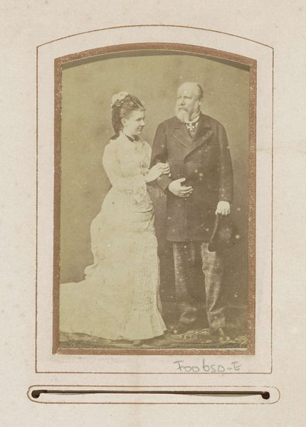Woodbury & Page created this mounted albumen print, "Portret van een man met een lange jas en een vrouw in een jurk," that captures a sense of formal portraiture. The sepia tones and the symmetrical composition immediately suggest a constructed reality, framing the subjects within the social conventions of their time. The textures, from the man's coat to the elaborate details of the woman's dress, are meticulously rendered. Note how the photograph constructs meaning through the use of visual signs. The clothing and setting, a patterned backdrop and ornate furniture, all speak to the sitters' social status and self-presentation. Consider how the arrangement and the gaze of the subjects also play into the semiotics of portraiture. The subdued palette focuses attention on the subjects’ attire and posture, revealing a desire for permanence and respectability. This image is not merely a record; it's a tableau vivant, carefully arranged to convey specific messages about identity and societal role.