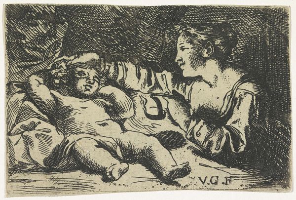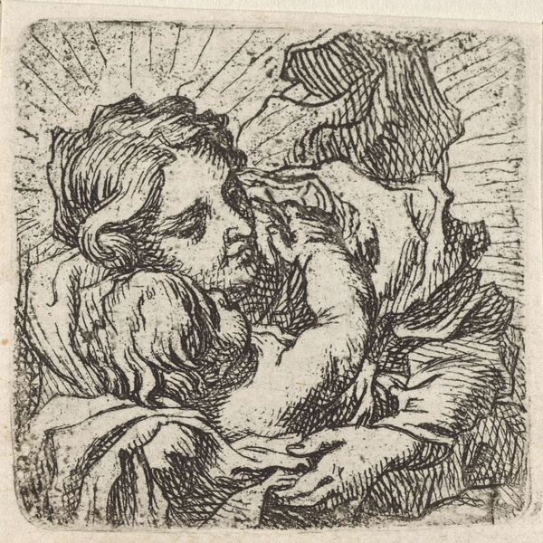 Curator: This intimate work is entitled "Madonna met kind" – or Madonna and Child. It's an ink drawing created sometime between 1618 and 1655 by Cornelis Schut and is currently housed here at the Rijksmuseum. Editor: It strikes me as immediately vulnerable, perhaps even apprehensive. The raw lines of the ink feel emotionally charged, and the figures seem to huddle together, as though for mutual comfort. Curator: Well, I would say that the Madonna and Child as a subject carries immense historical weight. This particular piece invites consideration within a larger framework of maternal representation and religious power dynamics, especially during the Baroque period, which saw increased polarization of spiritual ideals. It's intriguing how Schut negotiates these through line and form. Editor: Right, there’s a kind of desperate clutching depicted. Look at how the child's arm reaches, almost grasping at something just out of frame. To me, this implies a future, a destiny that is both desired and perhaps dreaded. We often read the Madonna as simply maternal love, but Schut is hinting at a premonition of things to come, and an underlying powerlessness against fate. Curator: And within that fate is inherent tension, not only religiously but also socially. During Schut's time, depictions of women, particularly within religious contexts, served specific ideological functions. His choice of stark ink lines could reflect broader social pressures exerted on motherhood and female virtue. There's something in the materiality here suggesting a subtle form of critique or perhaps empathy. Editor: The lines really vibrate, giving that intense quality, but what about the Madonna’s gaze, downward, inward… it's complex! What are the recurring symbols surrounding Madonna and Child imagery that speak to that psychology across time? Are they present, altered, or deliberately absent here? The cultural memory embedded in this archetype... fascinating! Curator: A cultural memory that Schut, knowingly or unknowingly, both perpetuates and slightly destabilizes with the choice of medium and the stark portrayal. The interplay creates such fascinating layers! Editor: It does, I’m not sure about critique exactly but this tension is what gives it its lasting appeal for me. Curator: Absolutely. These subtleties keep us coming back, to reconsider our reading of familiar figures in a transformed perspective.