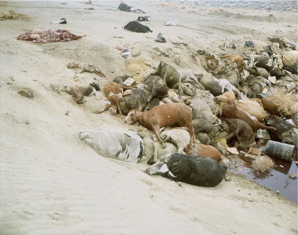 Editor: Richard Misrach's "Dead Animals #327, Nevada" is a C-print, possibly created between 1987 and 1998. It’s a pretty stark image—a dead animal, seemingly buried in sand or earth. The color palette is almost entirely variations of brown, adding to the somber mood. What do you see when you look at this work? Curator: Formally, the composition relies on a stark contrast between the texture of the earth, almost geological in its granularity, and the decaying organic form. Note how the diagonal thrust of the animal's head challenges the horizontal weight of the earth. Consider Misrach’s strategic placement of the subject – partly obscured, creating a tension between visibility and concealment. Is it possible that Misrach aims for the viewer to recognize the artifice in the presentation of reality, compelling a deeper reflection? Editor: I hadn't considered the angle as a point of tension. It almost feels like the earth is swallowing it, rather than just burying it. The textures really highlight that. Curator: Precisely. Think of how the variations in brown articulate the different textures, with the organic form showing gradual deterioration. Semiotically, this invites interpreting the decay not merely as biological process, but as the very emblem of transience. Editor: So it's less about what the animal was, and more about what it's becoming... or returning to? Curator: Yes, but what aesthetic effect emerges through this presentation? The inherent contradiction between beauty and abjection becomes significant to challenge our expectations. Editor: This perspective shifts the focus for me from a simple documentation to a commentary on natural cycles and the uneasy relationship between life and death. I’m starting to appreciate the subtleties of its form. Curator: Indeed, the stark reality of the image—rendered with considerable attention to visual language—asks much of its audience, which moves us away from sentimentality to engage on intellectual terms.