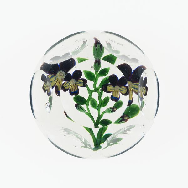 Editor: This is "Paperweight," a glass piece made around the 19th century by Baccarat Glassworks. It's currently housed at the Art Institute of Chicago. I’m immediately drawn to the miniature world captured inside the glass. What do you see in this piece? Curator: Well, let's consider the cultural context of 19th-century decorative arts. Paperweights, especially those of this complexity, became symbols of bourgeois refinement and taste. The Art Nouveau influence, visible in the organic shapes and delicate details, suggests an embrace of nature within domestic life. How do you think displaying such an item impacted the perception of its owner? Editor: It must have signified wealth and education. To have the leisure and appreciation for such delicate craftmanship indicates a specific social standing, right? The owner is presenting themselves as cultured. Curator: Precisely. Glassmaking itself was often supported by powerful social institutions, sometimes tied to royalty, with the purpose of driving public image, but here this paperweight shrinks its context. Instead of grand statements or religious purpose we have a singular miniature, which allows its owner, the viewer, to feel large and powerful themselves. Consider how its spherical form further confines and shapes that controlled world within. It reflects societal hierarchies within the walls of domestic space, doesn't it? Editor: Absolutely. It's fascinating how a simple object can tell such a complex story about societal structures and the values it represents. It’s making me question my own aesthetic biases. Curator: It shows how decorative objects are anything but neutral; they actively participate in constructing meaning and reinforcing social norms. The politics of imagery are present in the smallest details, in every sphere of our life. Editor: I hadn't really thought about paperweights in such a complex way. Thanks!