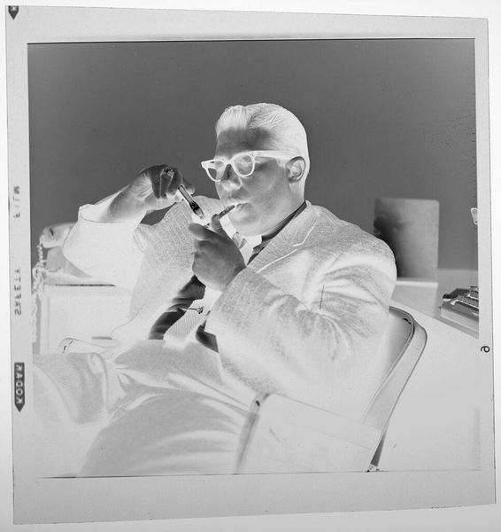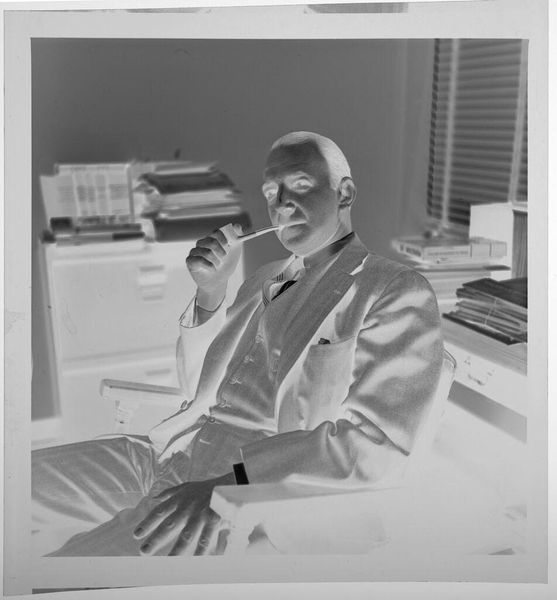 Editor: This silver gelatin print, "Untitled (man sitting at desk)" by Peter James Studio, presents a rather stark scene. The reversed tones create an unsettling mood. What does this emphasis on the photographic process reveal to you? Curator: The reversal highlights the labor involved. Consider the darkroom, the chemical processes. This isn't just capturing an image, but crafting one through tangible means. What does this say about the value placed on photographic work? Editor: It emphasizes the constructed nature of the image, and the skill in transforming material into art. I hadn’t considered the social implications before. Curator: Exactly. This challenges the idea of photography as mere documentation, reminding us of the labor behind every print. A powerful statement about production.