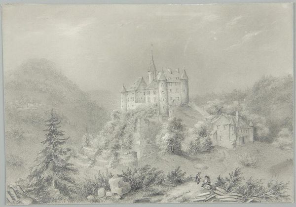 Editor: So, this is Thomas Cole’s "Castle of Spiez, Lake Thun," created in 1841 using pencil on paper. It’s remarkably delicate and serene. The mountains in the background feel both grand and somehow… distant. What strikes you about this piece? Curator: What grabs me is how Cole uses the Romantic landscape tradition to engage with questions of power and social structures. Think about the castle, positioned within this vast landscape. Who resides there, and what does their dominance mean in relation to the people and the environment surrounding them? Is it a symbol of security or a reminder of imposed authority? Editor: That's a perspective I hadn't considered. I was focused on the picturesque qualities, the beauty of the architecture against nature. Is Cole critiquing this power dynamic, then? Curator: Perhaps not overtly, but the drawing prompts us to examine those relationships. Notice how the natural elements – the mountains, the lake – dwarf the castle. Does that signify the resilience of nature against human constructs? Furthermore, how does the ‘sublime’ as experienced and portrayed in Romanticism, contribute to or challenge existing class and power structures? Editor: So you are suggesting that the scale and presentation invites an ongoing negotiation between humanity and the landscape? Curator: Exactly. And that negotiation, for Cole, as for many artists of his time, was imbued with complex political and social undertones reflecting tensions concerning land ownership, industrialisation, and emergent nationalist sentiments. The castle becomes more than just a building, but rather a potent symbol within a contested space. Editor: This really opens up a new way to read landscapes. I had never thought about these contexts. Thank you. Curator: It's a reciprocal process, though; the landscape, and our experience of it, is continuously informing and reforming the socio-political awareness of its viewers, including us today.