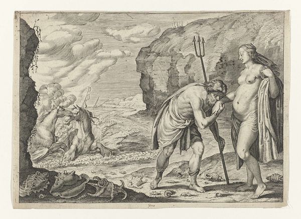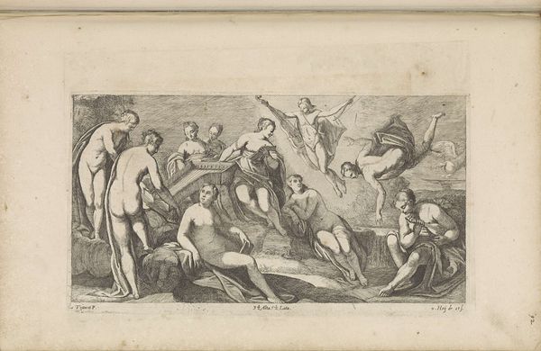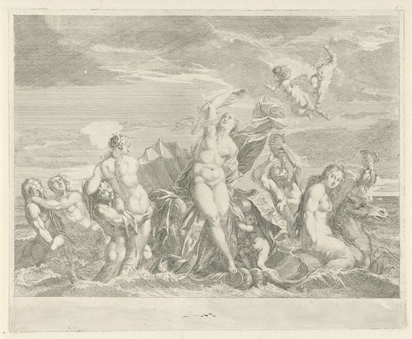 Curator: Looking at this dynamic composition, what is your initial reading? Editor: The overwhelming sense is one of chaotic abundance. A torrent of figures surging forward. The sheer density of lines, particularly in the lower half, creates a roiling, almost disorienting effect. Curator: Indeed! What you are perceiving is Cornelis Schut's engraving, "Triumph of Galatea," which dates to between 1618 and 1655 and resides here at the Rijksmuseum. Schut, deeply inspired by classical sources, presents an allegory richly embedded in symbolic meaning. Note how Galatea is flanked by lesser sea deities, each conveying nuanced aspects of aquatic dominion. Editor: The figures definitely evoke a sense of antiquity, with all the attendant allegorical weight one expects. Tell me, who is Galatea within this swirling vortex? Curator: Galatea, a Nereid—a sea nymph—is depicted at the center. She rides in triumph after rejecting the cyclops Polyphemus’ advances, symbolizing the victory of beauty and love over brute force. This narrative connects to broader themes of order overcoming chaos, civilized love resisting monstrous desire. Even the putti overhead contribute to the image, reinforcing her power and grace, but I am curious how this use of figures is reflected? Editor: Formally, that central grouping commands our attention by creating a vertical emphasis amidst the horizontal flow. Look how Schut balances the swirling mass of tritons and sea creatures below with the figures floating above, using a carefully structured pictorial logic to temper the otherwise overwhelming profusion of detail. The shading on the various characters' body gives the print a more dramatic effect too. Curator: Exactly. Each creature, each gesture, contributes to an iconography understood by a cultured 17th-century audience. But, moving beyond simple recognition, doesn't the surging tide of figures also tap into deeper archetypes of human aspiration and the perpetual tension between desire and fulfillment? Editor: I agree. The linear quality, a defining feature of engravings, adds a fascinating textural element that, when coupled with Baroque compositional exuberance, is arresting. Its impact lingers. Curator: This deep dive reveals a lot, so thank you. Editor: And to you. I feel more well informed.