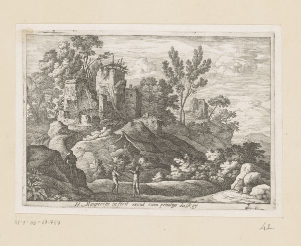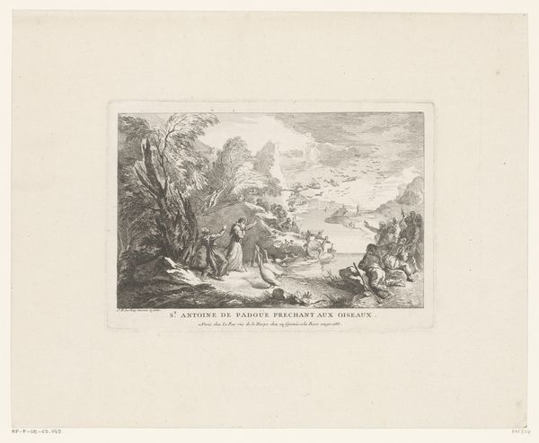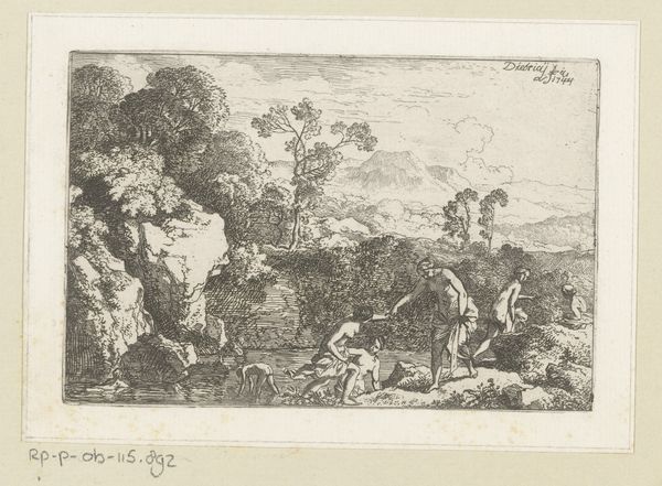 Curator: I'm struck by the dramatic chiaroscuro in this print. The figures almost seem to emerge from the rock itself. What do you see, Editor? Editor: It evokes a specific kind of anxiety, this scene. There's something almost claustrophobic about it despite the grandeur of the mountain. And look at the dynamics of the hunt, the colonialist implications. Curator: You're right, there's a tension here. This is "Jacht op gemzen in de bergen", or "Chamois Hunt in the Mountains." It's an engraving by Georg Christoph Steudner, made sometime between 1708 and 1756. Currently it lives here at the Rijksmuseum. Engravings like these offer insights into the relationship humans have to nature, framed within a specific historical lens. Editor: It certainly speaks to our fraught relationship with the natural world, but I'm curious about the way the hunt itself is depicted. Is it meant to celebrate human dominance over nature? There's a performative aspect to hunting that I see tied to wealth and class. The hunter versus the hunted. Who benefits? Curator: That's a powerful reading. Think of the Chamois as symbols. These creatures live in high, remote places; capturing them represents dominance not just over nature, but over challenging landscapes and perhaps even a sense of the unknown. Their horns themselves become trophies that carry their own potent iconography. Editor: I wonder about the mountain itself. What symbolic weight does it carry? Mountains can signify stability, permanence. But here, it also seems to amplify the precariousness of the hunt and, maybe, the hunter’s ego? The etching underscores humanity’s attempt to fix itself, or its image, within an enduring natural context. Curator: Absolutely. These mountains speak to us still. The engraving creates an environment ripe with both power dynamics and deeper allegorical elements. It speaks to cultural shifts occurring then but reverberates even now, in light of ecological destruction, conservation efforts and land sovereignty disputes. Editor: And as such it can show the complexity of a symbol, with nature embodying beauty, terror, control, and exploitation depending on the culture and era observing it. Thank you. Curator: Thank you, the mountain as a reflection of shifting ideals through generations is something to ponder.
