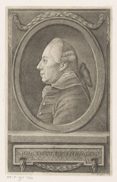 Curator: Here we have a portrait of Johann Kaempf, created in 1788 by Eberhard Siegfried Henne. It’s currently held in the Rijksmuseum’s collection and it's an engraving. What strikes you about it initially? Editor: The detail achieved with such limited material is astonishing. All those precise lines forming not just an image but texture, dimension… How long would this process have taken? Curator: Well, engravings of this kind were fairly common as presentation pieces in academic circles and for state officials; they spoke to status. Printmaking as a medium allowed for wider circulation than painted portraits afforded, contributing to a sort of visualized social network of notable people. Editor: And the engraver’s labor directly feeds into that status, doesn’t it? The craftsperson translates Kaempf’s authority into a reproducible commodity. Is there any record of what Henne might have been paid for a work like this, or of Kaempf’s role in commissioning it? Curator: Unfortunately, records of those commissions are scarce. What we do know is that academic art had the specific function to ennoble their subjects with the intent to teach posterity, therefore it functioned as history painting itself. Notice, too, how Kaempf is depicted within an oval frame, resembling ancient medallions or cameos. It is a typical framing structure of neoclassical works that also worked to reinforce his rank. Editor: Right. The trappings of classical influence elevated Kaempf. It’s interesting, though, how even with the classical nods, there's a tangible quality to the image. I am especially drawn to his robes and their layered design and texture. One can easily envision this figure from an earlier century of innovation in medicine or physics, such is his expression. Curator: Yes, despite the formal composition, Henne has imbued Kaempf with a distinct personality, evident in his direct gaze and slight smile. This gives the work a level of engagement that supersedes the purely formal nature of these academic prints. It’s this push and pull between public persona and intimate expression that makes it quite striking. Editor: Absolutely. Thinking about the social value conferred upon a subject by images, and seeing this labor so distinctly rendered… it really underscores how access to this kind of visual representation was and still is an exclusive realm. Curator: A potent reminder that the production and circulation of images were, and remain, deeply entwined with power.