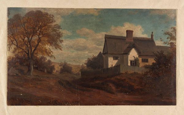 Curator: This watercolor sketch, attributed to Cornelius Varley, is titled "A Cottage." It resides in the Tate Collection. Editor: Immediately, I see a sort of pre-industrial idyll, but also a starkness—an almost lonely isolation conveyed through its muted palette. Curator: Varley, working in the early 19th century, tapped into the picturesque movement, but this humble cottage also brings to mind themes of land ownership and rural labor during a time of significant social upheaval. Editor: The cottage looms. Are the chimneys phallic symbols, markers of male dominance? The landscape, usually a symbol of freedom, seems to hem it in. Curator: Perhaps, but it is also about the romanticizing of nature, overlooking the realities of rural life for the working class. Editor: Fair point. I see the cottage not as a simple structure but as a complex signifier of power and social anxieties. Curator: It's always good to remember that the land is never just land, but a site of contestation. Editor: Yes, it gives us much to think about beyond just a pretty picture.