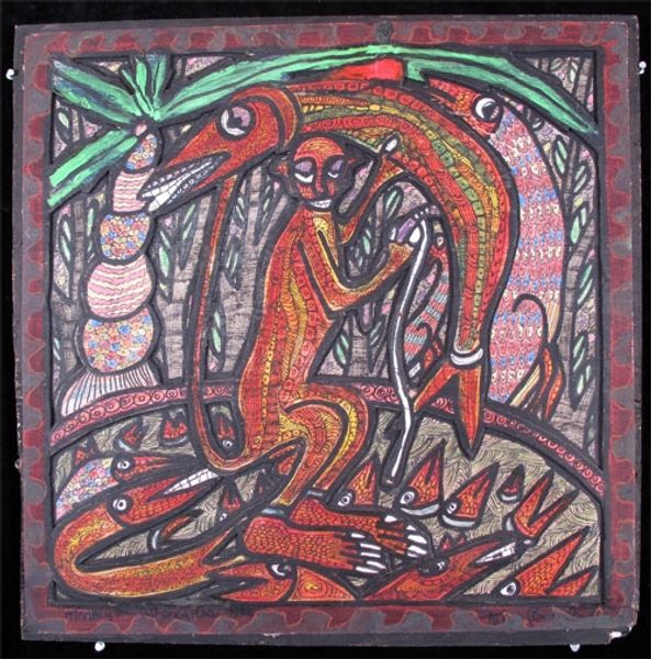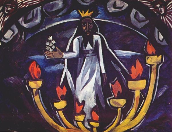 Editor: This is *Thoth Tarot* created in 1943 by Lady Frieda Harris using tempera. It has a whimsical fantasy art vibe that’s quite intriguing! There is an alchemical atmosphere here – with the lion, eagle, androgynous figure, and the inscription "Rectificando Invenies Occultum Lapidem" meaning roughly, "By correcting, you will discover the secret stone". How would you interpret its historical context in relation to its imagery? Curator: That’s an astute observation! Considering its creation during wartime, within the context of the Golden Dawn and Aleister Crowley’s Thelema, the card reflects a desire for inner transformation amidst global chaos. It visualizes the alchemical process of turning base metals into gold – a powerful metaphor for personal and societal change through understanding of symbolic language. This was intended to challenge conventional spiritual pathways while the globe was burning. Does this resonate with your understanding of art and social movements? Editor: Absolutely. It's fascinating how historical tension manifests itself within allegorical compositions. Do you think its symbolic language contributes to how viewers experience and interpret its socio-political role? Curator: Definitely. The symbols aren’t accidental, rather deliberately esoteric and transformative, aligning it with counter-cultural movements of the era. As modern society grows and changes over time, this kind of art stands the test of time because it's complex imagery prompts discussion of society's current goals and motivations, isn't it? It urges a constant reevaluation of our ideals and biases. Editor: So the continued engagement with the Tarot deck demonstrates the enduring desire to reimagine societal structure? Thanks, that gave me a better perspective on how art is embedded in political and cultural movements! Curator: Exactly. It reveals that art doesn't exist in a vacuum and reminds us that its public function may evolve. A fruitful inquiry, indeed.