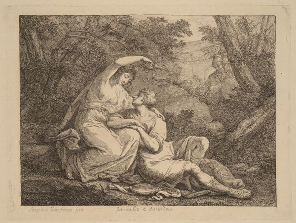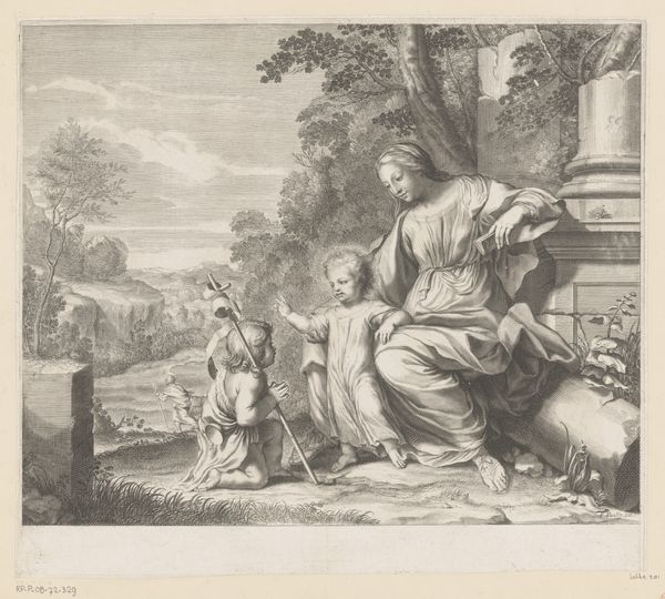 Curator: Let’s turn our attention to an engraving from the Rijksmuseum’s collection entitled “Heilige Familie met Johannes en Elisabeth”, or “The Holy Family with John and Elizabeth”. It’s dated sometime between 1600 and 1666, and the artist is, alas, anonymous. Editor: Immediately, what strikes me is how wonderfully human they appear, amidst this very structured landscape. Not floating on clouds but sitting amongst the trees with a sense of casual dignity. Curator: Yes, it’s a masterful combination of the formal and the informal, typical of baroque history painting. The work situates the figures, typically revered as sacred, within an accessible, almost pastoral setting. How does the depiction here either reinforce or challenge contemporary understandings of familial piety and maternal virtue, do you think? Editor: It’s interesting... Joseph, back there in the shadows is dutifully pouring over scripture, while Mary appears completely enthralled by her son. Her eyes are lifted as if she can envision a halo just above his baby curls. This engraving almost invites us to consider Mary not just as mother of the divine, but also, well, as simply, divine herself. It’s powerful stuff, symbolically speaking, to include Saint Elizabeth and her son, John the Baptist. The work becomes a celebration of motherhood across generations. It makes you wonder, who would have consumed and reflected on works like these? What was family life like in the homes or halls where a work like this may have been found? Curator: Precisely. The composition here draws heavily from the established visual rhetoric of religious authority, and then places this into a conversation about human relationships. I think you’ve touched on an important point about the consumers, though. Engravings made art more accessible to a wider audience beyond the aristocracy, spreading visual culture and fostering a shared set of ideals around faith and family, and especially in that era the role of mothers, specifically. Editor: Right. Even now, stepping back and letting my eyes blur, the composition is simply beautiful. Light dances across the family unit but darkens the landscape behind it and adds weight. I'd like to think the engraver saw this compositionally and thought, yes, this has the sort of complexity that might allow someone to stand and dream about it in a public space for centuries. Curator: It is compelling, the way in which it embodies both the sacred and the familiar, and prompts questions about artistic creation as an enduring form of cultural dialogue. Editor: Agreed. What a moment in ink.