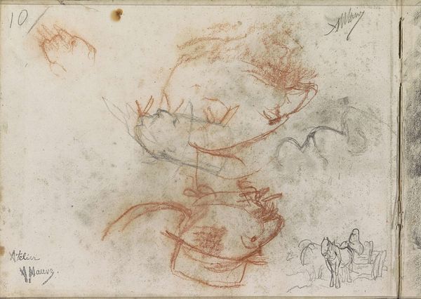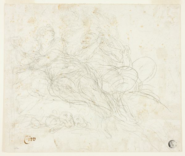 Curator: Here we have a drawing on paper with pencil and chalk, attributed to Ciro Ferri, titled "Unidentified Biblical Scene." Editor: My immediate sense is one of quiet drama. The lines are delicate, almost hesitant, giving it a dreamlike quality. Curator: Ferri, a prominent figure in the Roman Baroque, operated in a world dominated by the Church, influencing art and thought. This biblical scene, though unidentified, connects with the period’s larger interest in history painting, in sacred dramas as pedagogical tools for social control, for conveying specific religious beliefs about gender roles, social hierarchy, and divine will. Editor: It's interesting you mention pedagogy, because despite the apparent softness of the sketch, certain images are indeed stark and imposing. Notice the bowing figure in the foreground, rendered in great detail—is the angle a form of obedience? His clothing is more realistic than the barely-there sketches in the periphery. Curator: Exactly! Consider how, within a patriarchal framework, certain bodies, like the subservient one you've mentioned, are centered in religious narratives, perpetuating cultural attitudes of dominance. How are these characters shaped to tell a specific moral story that continues to influence social perception? Editor: The repeated oval shapes are arresting; the artist created depth by layering many, with a key cluster hovering near the center-left. Are we meant to feel the pressure of a watching crowd? Curator: Indeed. Religious works can operate to create a sense of surveillance, or a perpetual accountability to religious dogma. In addition to the historical-religious context, looking at the symbolic and emotional resonance this image continues to have could provide us new paths. Editor: Looking again, I also notice an overall feeling of transience – this medium implies change and process. Ferri is searching for clarity amidst religious and social expectation, giving this unfinished scene a voice that speaks even today. Curator: It also shows how art serves to represent shifting ideas within ideological structures. The unfinished quality of this work might reflect moments of negotiation, where religious values can be questioned and reconstructed. Editor: I'll be pondering the balance between the definite lines and ethereal suggestions in this sketch—and what such tension tells us about image making itself. Curator: It reminds us how each image is the result of complex sociohistorical forces working together. It seems this image carries not just history, but its potential reinterpretation within present contexts.