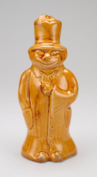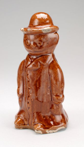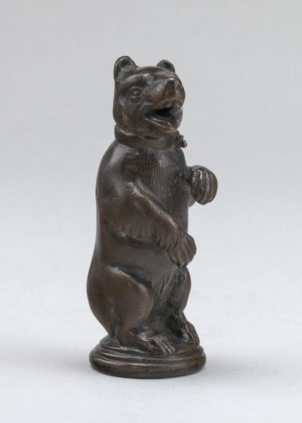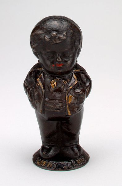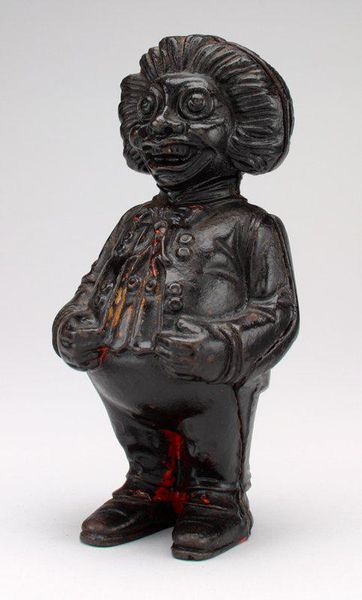 Curator: Immediately striking. There's a captivating presence emanating from the object, an earthy, muted quality. Editor: Indeed. What we have here is a cast metal still bank dating from roughly 1910 to 1925, attributed to John Harper & Company, Ltd. It carries the contentious title “-Golliwog- still bank” and it resides here at the Minneapolis Institute of Art. Curator: The materiality speaks to a particular era, and there’s something wonderfully basic about its construction— a weightiness implying solidity and permanence that directly counters its more transient and problematic place as a token of cultural representation. Editor: It’s impossible to engage with this piece without acknowledging the charged history of the “Golliwog” figure. Originally appearing in children's literature, it soon became a prevalent and highly offensive caricature, laden with racist connotations deeply embedded in colonial narratives and minstrelsy. Curator: Absolutely, and that historical context is key. To analyze it, one must grapple with how this object, ostensibly innocuous as a child’s coin bank, participated in the broader cultural machinery of racial stereotyping and discrimination. Editor: From a formal perspective, however, the simplicity of the sculpture’s contours is noticeable. The large eyes and exaggerated lips underscore the distorted portrayal of Black people pervasive during that time. It’s a blatant, almost primitive execution, reinforcing harmful stereotypes through visual exaggeration. Curator: Precisely! Its very existence as a commonplace object – something children would interact with daily – highlights the insidious way such stereotypes were normalized and perpetuated in society. Its artistic merit is secondary to the cultural damage it signifies. Editor: It invites a certain cognitive dissonance though. One recognizes the artistry present, the crafting that occurred to form the metallic object; the smooth finish and subtle gleam across its form, all juxtaposed with the piece’s controversial subject matter. It creates a visual and conceptual tension. Curator: I leave reflecting how art acts a persistent witness, recording not just aesthetic developments but also society's deep-seated prejudices and ongoing struggles for racial equality. Its existence now acts as a solemn reminder of our shared history and hopefully the vigilance we must observe. Editor: It is certainly impossible to look at without experiencing conflict, both with the image and how it still circulates and continues to shape contemporary discussions about racial representation and art’s complicated relationship to social change.