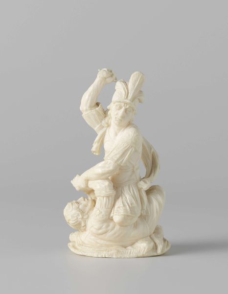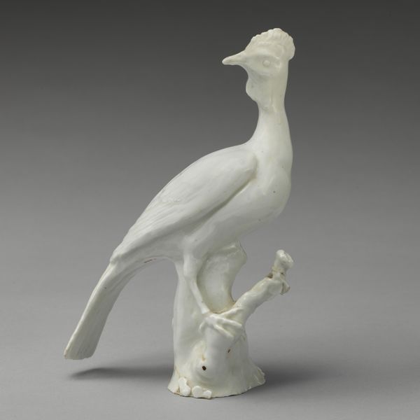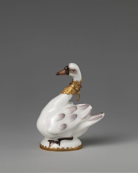 Editor: This delicate sculpture is called "Finch," created sometime between 1740 and 1750 by the Chelsea Porcelain Manufactory. It’s porcelain, and incredibly lifelike! It makes me think of springtime. What formal elements strike you when you look at it? Curator: The initial element that captures my attention is the use of porcelain itself. The material inherently connotes a certain fragility and refinement. Notice how the smooth, unbroken surface emphasizes form, leading the eye through the sculpture's undulating lines. Consider also the implications of monochrome - the absence of color shifts the focus entirely to texture and contour. Editor: That's fascinating, I hadn't thought about how limiting the color palette can actually emphasize the other design elements. Do you think the piece conveys a particular message? Curator: In considering possible 'messages' let us reflect upon the fact that the figure is carefully posed on a faux-naturalistic base, thus encouraging reflection on the role and status of nature and the 'natural'. To consider also, how this placement affects not just the bird itself, but invites one to examine the structural framework in relation to our perception. Editor: I see, so it's less about direct symbolism and more about how the materials and composition play with our ideas about the natural world? Curator: Precisely. One might even see the stark whiteness as a statement against the riotous color found in nature, inviting consideration on what exactly nature consists of, both as subject, as a referent for artifice, and a symbol of wealth and prestige. What aspects do you feel resonated most? Editor: For me, understanding the deliberate use of porcelain to guide our focus on form and texture has really deepened my appreciation of the piece. Thanks for opening my eyes! Curator: It has been my pleasure; examining the formal choices available to an artist will consistently offer fruitful opportunities for understanding their art.